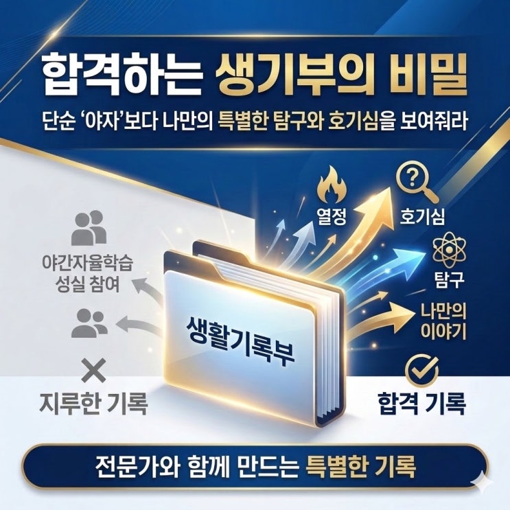 나의 성실함을 나타내는 야자는 생기부에서는 왜 빛을 잃을까? 매년 졸업생들의 생활기록부를 분석하다 보면 가장 안타까운 순간이 있습니다. 바로 학생의 노력이 생기부 상에서는 그저 무미건조한 '성실함' 정도로 포장되어 끝이 나는 경우가 있을 때입니다. 대표적인 예가 바로 '야간자율학습에 빠짐없이 참여하여 자기주도학습 능력을 기름'과 같은 단편적인 기록입니다. 학원도 포기하고 생기부에 성실함을 기록하고자 어떻게든 어필하고 싶은 마음은 충분히 이해합니다. 하지만 냉정하게 입시의 관점에서 말씀드리면 입학 사정관의 눈에 이런 기록은 전혀 매력적이지 않은 '죽은 기록'에 불과합니다. 남들과....... <img src="https://blogthumb.pstatic.net/MjAyNjAzMTBfNjUg/MDAxNzczMTEyNzY4NDA1.tmXbjqiYLstesXdKCQ1zH3H6UwlcwP1Zbgx2vktLxhIg.1JlNTWMKblpBBUhf1iTeLtSKK8Uxc-6skDUuxWj-Edkg.JPEG/unnamed.jpg?type=s3" />