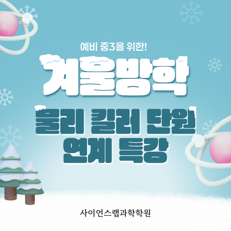 안녕하세요. 소수정예 과학고·영재고 입시컨설팅까지 둔촌동 과학학원 사이언스랩과학학원입니다. 이번 겨울방학을 활용해 중3 과학과 고등 통합과학을 한 번에 정리할 수 있는 특강을 준비했습니다. 이번 특강은 중학교 단계에서 반드시 정리해야 할 ‘물리의 흐름’을 이해하는 것에 초점을 맞추고 있습니다. 중3 과학 + 고등 통합과학을 동시에 학습합니다! 본 특강은 중3 과학 「Ⅲ. 운동과 에너지」와 고등 통합과학 「Ⅲ. 시스템과 상호작용 2. 역학 시스템」을 하나의 연속된 개념 흐름으로 학습할 수 있도록 구성되어 있습니다. 중학교 과학 개념을 단순 암기가 아닌 이해 중심으로 정리하고, 고등학교 물리에서 다시 등장....... <img src="https://blogthumb.pstatic.net/MjAyNTEyMTZfODIg/MDAxNzY1ODU2MDY4MjU4.9Jqmlx2a1Fth7Kyty980taOtGxcDmivb-18yF5CdTccg.eWpPLjr1blC4W8Jyzd3uENX3qzSRLwQpztpsz3D2qYog.PNG/%B5%D0%C3%CC%B5%BF_%B0%FA%C7%D0%C7%D0%BF%F8.png?type=s3" />