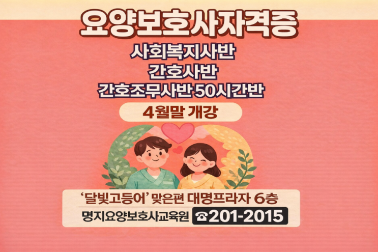 #명지간호학원국비반3월24일개강. 지금 수강신청 중~~~ ☎️ 201-2015 #명지요양보호사교육원자격증반 사회복지사, 간호사, 간호조무사 자격증반 4월말 개강예정입니다. 50시간 수업/실습하고 마치는 반, 미리 유튜브로 공부 시작해 주세요. 아래 화면 누르면 시작, 듣기만해도 합격 1m 거리입니다~ 구체적 개강일정 4월10일에 연락주세요~ ☎️ 201-2015 <img src="https://blogthumb.pstatic.net/MjAyNjAzMTVfMjE4/MDAxNzczNTM3MzkxNjMx.xifiT37DiP7Bsh1BXUQzBayBwdhELgbYq_jE0020UNIg.2HK_yGSakHI55HX6-dCQGahI3UWVGatS4xDgae9hURog.PNG/900%A3%DF1280%A3%DF1772586080197_%A3%A82%A3%A9.png?type=s3" />