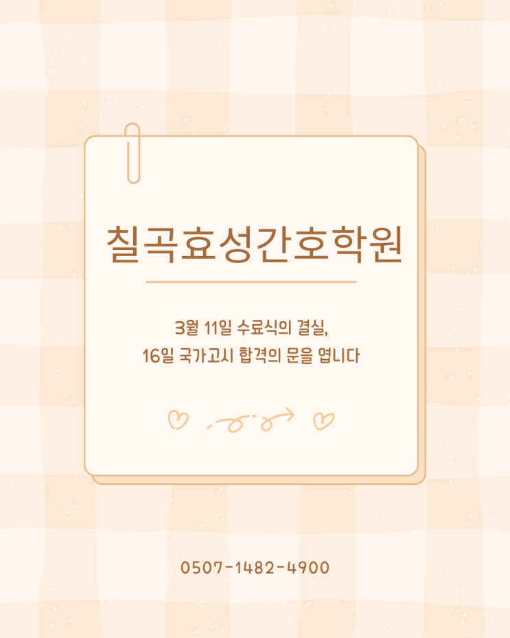 안녕하세요. 대구 칠곡 지역에서 간호 인재 양성의 중심을 지켜온 칠곡효성간호학원입니다. 어제인 3월 11일, 본 학원 강의실에서는 그 어느 때보다 가슴 벅찬 감동의 순간이 있었습니다. 오랜 시간 이론 강의와 현장 실습이라는 여정을 묵묵히 완수해 낸 수강생분들의 수료식이 진행되었습니다. 3월 11일 수료식, 열정이 빚어낸 소중한 시간 어제 거행된 수료식은 단순한 교육의 종료가 아닌, 전문 의료인으로 거듭나는 숭고한 약속의 자리였습니다. 한 분 한 분 수료증을 받으실 때마다 강의실 곳곳에서는 축하의 박수와 그간의 노고를 위로하는 따뜻한 눈 인사가 오갔습니다. 특히 이번 기수 수료생들은 다가오는 3월 16일 국가시험을 불과 며....... <img src="https://blogthumb.pstatic.net/MjAyNjAzMTJfMTkz/MDAxNzczMjkxODQxNjEy.N_jih-WH3mXenTbss2UjKu9XBP1a-A82l4UAmsCDvXQg.kasQBQctOl_ACN2K8307Ea3-plkRd9HXKw5YlgVANbkg.PNG/%C4%A5%B0%EE%C8%BF%BC%BA%B0%A3%C8%A3%C7%D0%BF%F8_3%BF%F9%BC%F6%B7%E1%BD%C4_4%BF%F9%B0%B3%B0%AD.png?type=s3" />