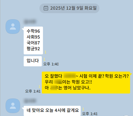 명진에듀학원 중학교 1학년 인화여중 / 선화여중 / 선인중 시험이 끝났습니다. 아이들 너무 고생했고, 너무나 대견했습니다. 아직 중1 이라 그런가... 아이들이 시험 끝날 때마다, 저한테 카톡을 보내는 것도 기특합니다 ㅋㅋ 요 친구는 선인중 다니는 학생인데 초등학교 때까지 보습학원을 다녀본 경험이 없습니다. 그래서 처음에 엄마랑 왔을 때, 걱정을 많이 하셨는데, 학원에서도 열심히 했고, 집에서도 열심히 노력한 결과, 평균 90점 이상 달성했습니다. 이 친구가 학원 앞에 살아서 종종 학원 출근하다가 만납니다 ㅎ 어머님도 너무 좋으시고 예의가 바른 아이라 정말 예쁩니다. 사실 사회생활에서 인사가 절반은 한다고 하잖아요? 그런 부....... <img src="https://blogthumb.pstatic.net/MjAyNTEyMTJfMjMg/MDAxNzY1NTI0NTYzMDcx.tQ5xNUAQqEdbuY9ivkMmuS6oNoQ70P527hrYBe4t_MIg.4coKIIXTWNkqZ4fDo9DM4Ri6HBXXWUINgwQrEMRA_uMg.PNG/image.png?type=s3" />