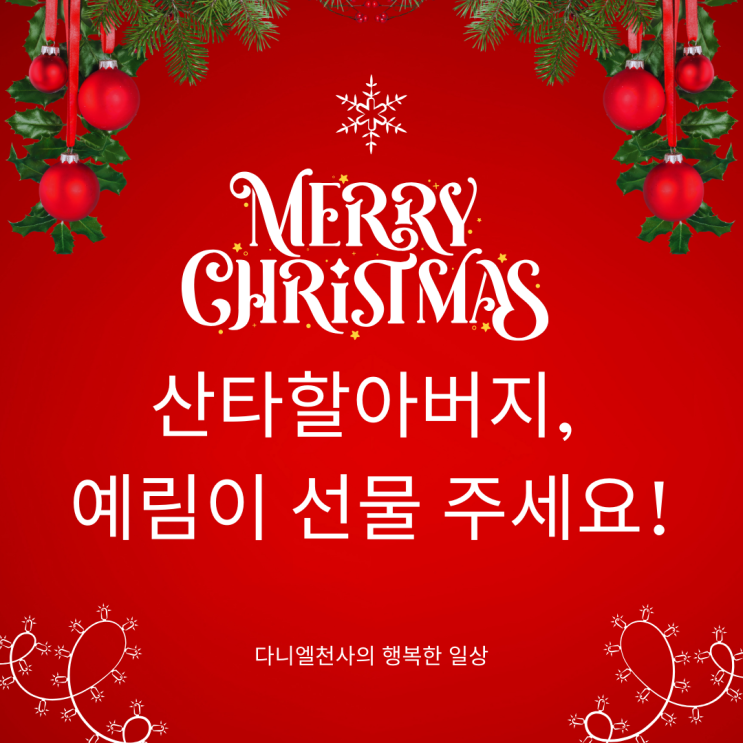 어린아이처럼 크리스마스를 기다리는 울 예림이! 올해는 산타할아버지가 어떤 선물을 주실까? 나도 설레는데, 넌 얼마나 설렐까? 손뜨개 목도리를 두른 예림이의 모습이 포근하고 따뜻해보여 정말 사랑스럽다. 지난해보다 더 성숙해보이니 사실 좀 마음은 ~~~ 예림이도 크리스마스 장식을 하니 더 사랑스러워 보인다. 사실 이렇게 똥개언니네서 예쁜 사진을 찍어주셔서 좋기도 하지만, 가끔 우리 가족과 함께 찍은 사진이 없는 것 같아 아쉽다. 다음번에는 기회를 만들어서 온 가족이 함께 추억에 남을 사진을 찍어 남겨야겠다. 예림이랑 성탄절을 올해에 여섯 번째 보내게 된다. 시간이 정말 빨리 가는구나! 예림이가 건강하게 우리랑 오래오래....... <img src="https://blogthumb.pstatic.net/MjAyNTEyMTRfMTUy/MDAxNzY1Njk3MDY5NzYz.MJYlC1jPcQySZUVpuIzuJEXwm23gtGuAvfaydeh8pq4g.XadCev3Enbr1U98zFt1nYbAiL_3DrVEBogSnGWRl9Msg.PNG/155.png?type=s3" />