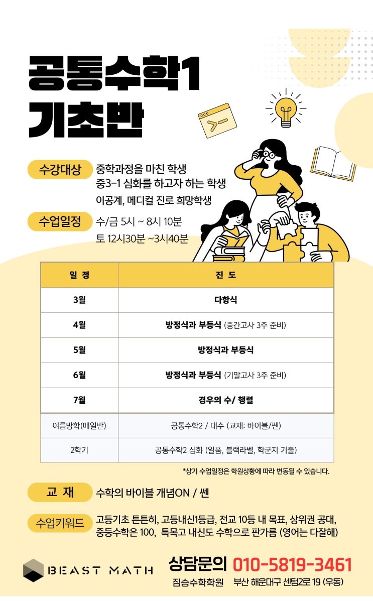 안녕하세요. 등급업의 솔루션 짐승수학학원입니다. 공통수학1 Basic 반 안내드립니다. 과정 : 공통수학1 Basic 개강 : 상시모집 수업 : 수/금 5시~8시10분, 토 12시30분~3시40분 교재 : 수학의 바이블 개념ON / 쎈 대상 : 중등과정이 마무리된 무학년제 기간 : 4개월 과정(16주) 담당 : 윤현철 원장 1학기 기말이 끝나면 공통수학2 가 진행되고 방학 대수 특강이 함께 진행될 예정인 커리큘럼입니다. 레벨 테스트 있습니다. 문의사항은 010-5819-3461 로 연락부탁드립니다. <img src="https://blogthumb.pstatic.net/MjAyNjAzMTRfMTgz/MDAxNzczNDY0OTYzNTMx.FcXWZGPRtrQHgWBq51NEVC6UVKcj6Z9NeMQNk2GgES4g.-z_9A1Sx4Yz4_MbfU5JTsvV3BOY0Fbw6r7U8HGBSTDIg.JPEG/%BB%E7%C0%CC%B4%CF%C1%F6_%281%29.jpg?type=s3" />