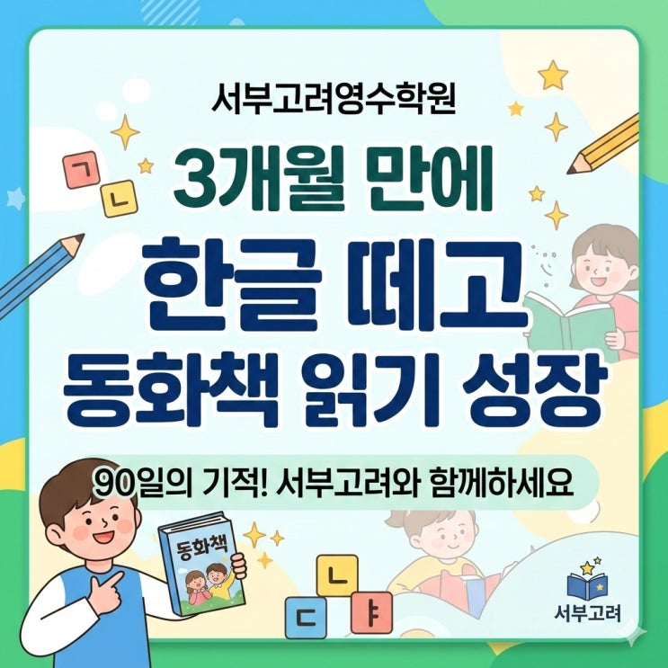 안녕하세요! 서부고려영수학원 문 원장입니다. 예비 초등 부모님들이나 저학년 학부모님들을 상담하다 보면, 가장 많이 하시는 걱정이 있습니다. "집에서 가르치려니 싸우기만 하고, 진도는 안 나가요. 이러다 학교 가서 기죽으면 어떡하죠?" 결론부터 말씀드리면, 걱정 마세요. 서부고려에서는 딱 '3개월'이면 충분합니다. 왜 '서부고려'는 3개월 만에 동화책을 읽을까요? 단순히 글자를 암기하는 방식으로는 절대 3개월 안에 독서까지 갈 수 없습니다. 20년경력의 **'성장 메커니즘'**이 있기 때문입니다. 1. 원리를 깨치는 '소리 학습' 무작정 외우는 통글자가 아닙니다. 자음과 모음....... <img src="https://blogthumb.pstatic.net/MjAyNjAzMDNfMjk5/MDAxNzcyNTE4NDUyMTcz.1Hk9xtsP3UavsaJnqXUlL9673Qlx0W8E6k1T8zniwpcg.19Gj2S0i9FAnyi-JEoBqdbt5BUI3lfqyGY4hmbU3NKQg.JPEG/KakaoTalk_20260303_145903128.jpg?type=s3" />