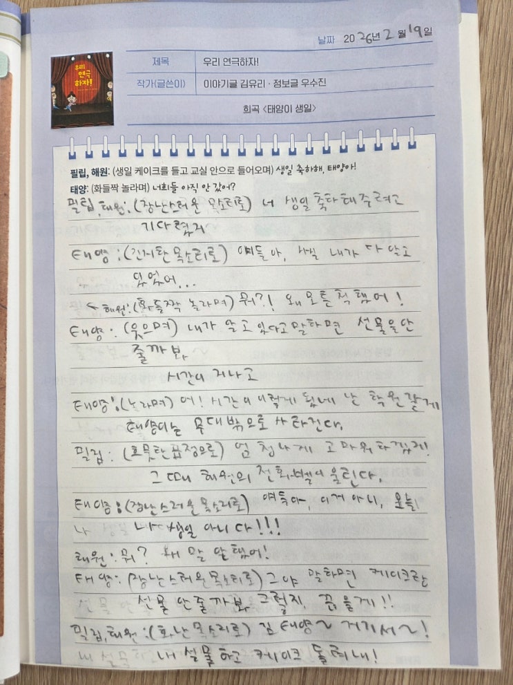 이 수업을 할때 제가 소장한 시나리오를 보여줍니다 기생충,헤어질 결심 아이들이 모르는 영화지만 이렇게 영화를 위한 대본이 있듯이 연극을 위한 대본도 있다는 것을 각인시켜주려고요 짧은 콩트같은 이야기지만 반전에 반전을 숨겨놓은 5학년 친구의 글솜씨를 보면서 재능이라는게 이런거구나 싶었어요 <img src="https://blogthumb.pstatic.net/MjAyNjAyMTlfMyAg/MDAxNzcxNDk3OTM4MjIz.RMe8ls3SL10xOMH7ijPbRKgP_YcbtMpqWfshnZ-dooYg.paURtjo8tIWhnaqmRX6lngCychEN_jWdkY34JLnqDNQg.JPEG/900%A3%DF20260219%A3%DF163331.jpg?type=s3" />