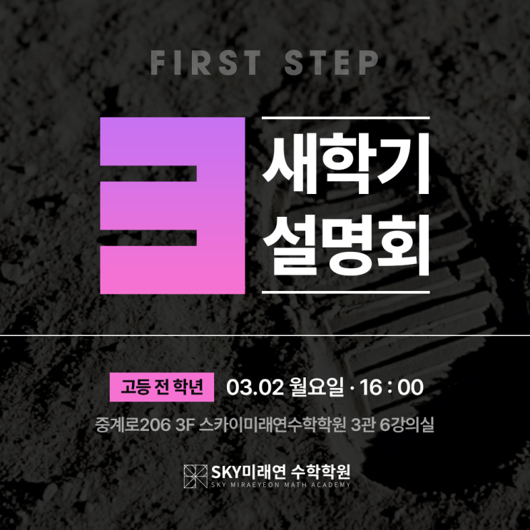 안녕하세요, '수학 교육의 미래를 여는' SKY미래연 수학학원' 입니다. 고등 내신의 첫 단추! 오는 3월 2일 4시 3관에서 3월 새학기를 맞아 고등 설명회를 진행할 예정입니다. [새학기] 퍼스트 스텝 고등부 설명회 · 일시 : 03월 02일 월요일| 16:00 - · 대상 : 고등 전 학년 · 장소 : 노원구 중계로206 3F 스카이미래연수학학원 3관 6강의실 · 신청문의 : 02-939-5617 * 2시간 무료 주차 가능 (위치 : 유경데파트 지하주차장) 설명회 신청하기 [모집중] TWO TRACK반 · 대진여고 2학년 대상 상담 문의 : 02-939-5617 https://skyfuturemath.com/ 미래연에서 이뤄낸 성과들 [[용화여고 1학년] 2학기 종합 전....... <img src="https://blogthumb.pstatic.net/MjAyNjAyMjdfMTA4/MDAxNzcyMTc3MzI4NjE0.CiB7u7q643tfbPuEsm-wdQLUdsed_WJIqRT-Du6BFfcg.paxL5U_VHr1tAPe7gcXI-jo-Mz48gKJXaKLoPFcbQo4g.PNG/%BB%EA%C8%F8%B1%E2_%BC%B3%B8%ED%C8%B8_%BD%E6%B3%D7%C0%CF.png?type=s3" />