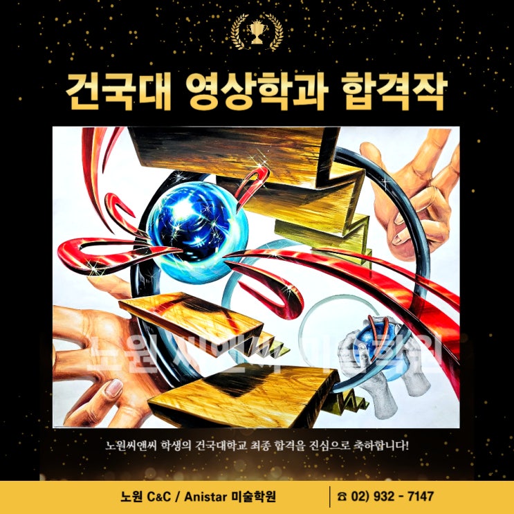 안녕하세요~ 노원 씨앤씨 애니스타 미술학원입니다 오늘은 저희 합격생중의 하나인 건국대학교 영상학과에 합격한 학생의 인터뷰와 합격작을 공개해보려합니다 ✨ 태ㅇ고3 / 전ㅇ연 - 건국대학교 영상학과 합격 수기 ✨ 늦게 입시 미술을 시작해 걱정이 많았지만, 선생님들의 시범과 세심한 피드백 덕분에 빠르게 실력을 끌어올릴 수 있었습니다. 목표하는 정시전형 학교에 맞춰 초반에는 성적 향상에 집중하고, 후반에는 학교별 기출 유형과 예상 주제를 연습하며 실전에 대비했습니다. 학생 개인의 그림 장단점에 맞춘 지도 덕분에 빠르게 그림의 목표를 세울 수 있었고, 실제 시험에서도 당황하지 않고 침착하게 마무리할 수 있었습니다....... <img src="https://blogthumb.pstatic.net/MjAyNjAyMjdfODAg/MDAxNzcyMTk2ODI2MDg4.BiJUTXBPRAHbShmHJ6NnpUo9fqJCFzutCISe-KaB5rsg.XA8PrlHMW_LeSr3Ym-pVIX5GRFI4WANIW0uUSjkZVMQg.JPEG/010.jpg?type=s3" />