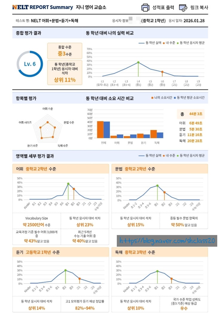 2025년 하반기 NELT를 시행하였습니다. 학생들은 평소에 갈고 닦은 실력을 확인해 보는 시간. 지니샘은 테스트 결과에 따라 커리큘럼을 수정, 보완해 보는 시간. 그 결과를 기록해 봅니다. 2등급 (전국 상위 5~11%) 3등급 ( 전국 상위 12 ~ 23%) 1년의 성장 2단계 이상 상승 : outstanding progress ◆ 영역: 종합 ◆ 영역: 어휘 ◆ 영역: 독해 ◆ 영역: 문법 ◆ 영역: 듣기 1년의 성장 파닉스 ~ Seed, Bud 클래스 까지 6개월의 성장 종합 영역 1단계 상승 : Progress 6개월의 성장 영역별 2단계 상승 : Outstanding Progress 각자의 보폭으로 한 걸음씩 성장하는 지니 영어 교습소 학생들의 2025년 성장 기록이었습니다. <img src="https://blogthumb.pstatic.net/MjAyNjAyMTRfMjMz/MDAxNzcxMDU0MTQyMTg1.RLJiO0r0VOPODbu-nW8IIWYEh402cbwnixSNIqpKswQg.PB5FXLjov8OJIfllKqKp7KjIemClPdf0KHmCaEJgq44g.JPEG/JH_26.jpg?type=s3" />