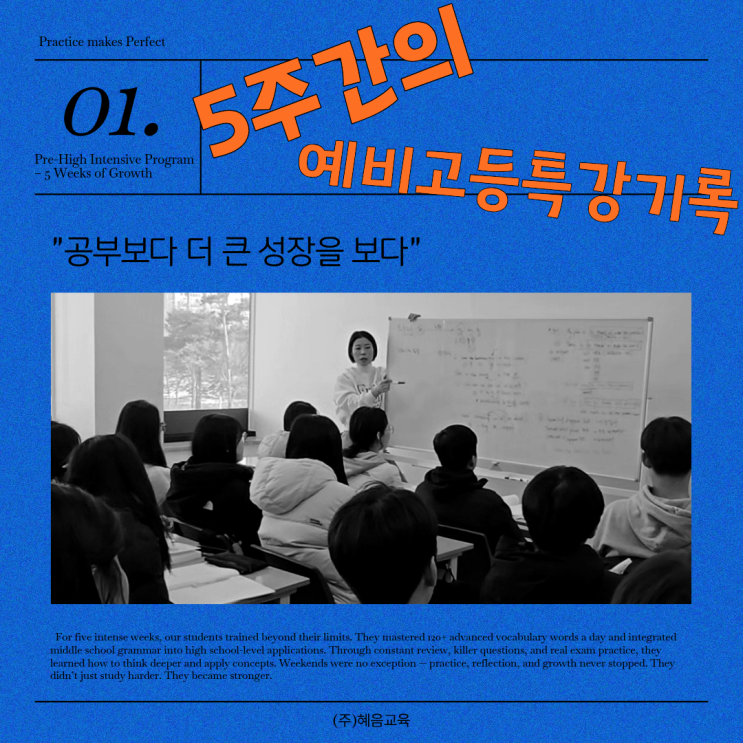 내 새끼들, 5주 동안 정말 고생 많았다 월수금 2시간 수업에 1시간 넘도록 구두테스트, 화목토 추가개별보강에 원장님과 눈이 마주칠 때마다 즉문즉답! 중간·파이널 평가에 주말 오답 수업까지. 원장님은 그 시간 속에 너희 표정이 다 기억난다^^ 피곤한 얼굴로 잠도 덜 깬 채로 교실로 들어오던 모습, “아...” 하던 한숨, 그래도 끝까지 되새기며 중얼중얼 외우던 모습 솔직히 . . . 쉽지 않았지? 원장님도 알아. 하지만, 해년마다 겨울방학마다 행해지는 예비고등 특강은 너희들의 선배들도 10년 넘도록 단 한 해도 빠지지 않고 진행했던 전설의 수업이다!!! 하루 120개가 넘는 고등 단어, 파생어까지 확장해서 외우고, 중등 문법을....... <img src="https://blogthumb.pstatic.net/MjAyNjAyMTlfNjEg/MDAxNzcxNTEwMTk2NDcx.CfFQ5HINSy9lEqZ6VSrb2vEQiJGo1ouN5A4PqE1s0I0g.drPe0wcsbKs9zM2WH1MCDKXYleHn2n2WHcckU1SyyBsg.PNG/%C6%AF%B0%AD.png?type=s3" />