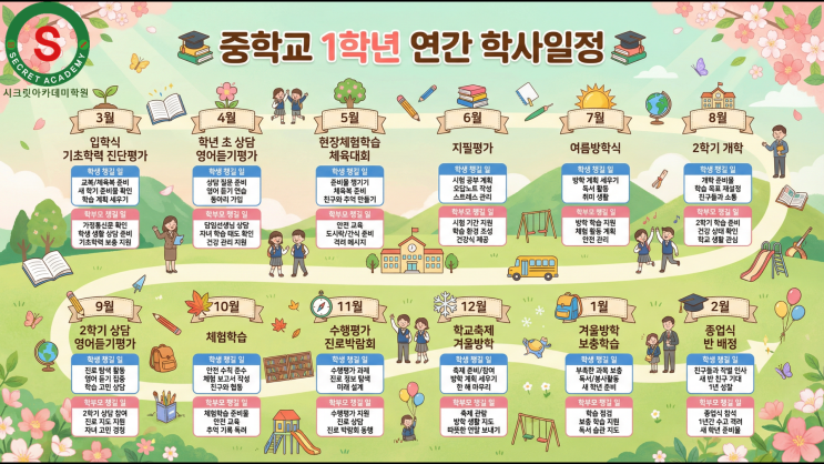 중학교 1학년 연간 학사일정, 미리 알고 준비하면 성적이 달라집니다. 중학교 입학, 준비된 학부모만이 아는 비밀 안녕하세요, 동춘동 수학학원 시크릿아카데미학원 원장입니다. 매년 2월이 되면 초등학교 6학년 학부모님들께서 같은 질문을 하십니다. "중학교 올라가는데 어떻게 준비해야 하나요?" 그리고 3월 입학식이 끝나면 이렇게 말씀하시죠. "생각보다 빡세네요." 20년 넘게 중학생들을 가르치며 깨달은 사실이 있어요. 중학교 1학년 성적은 '운'이 아니라 '계획'으로 만들어진다는 것입니다. 그리고 그 계획의 핵심은 바로 중학교 연간 학사일정을 미리 파악하는 것입니다. 오늘은 중학교 1학년....... <img src="https://blogthumb.pstatic.net/MjAyNjAzMjBfMTg5/MDAxNzc0MDA2MDY3MzIz.spTr8wKHJfSAiZ8fma1yUesE5VkYehd5C-6npa8beQwg.PElwt2oAU5pka4P7pX7WrNUJDnorl-EkejAsMjMFsZgg.PNG/%EC%A4%3F1%3F%95%99%3F%82%AC%3F%9D%BC%3F%A0%95.png?type=s3" />