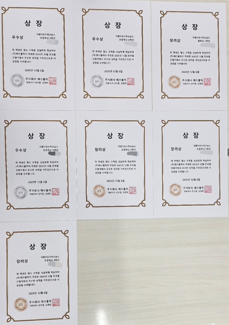 이번에 상을 못받은 아이도, 상을 받았지만 조금 더 잘 할 수 있었다는 아쉬움이 남았던 아이도, 모두모두 잘해주고 있고 너무 기특하답니다♡ <img src="https://blogthumb.pstatic.net/MjAyNTEyMTFfMTMz/MDAxNzY1NDQwNDg2NTc1._N3fWLfPcfFCQGZWHhSHu2Renfobts81MgBh7jULwAMg.UICO9zvw94Kll0-lgXHRQDn6dAs9pjzaGOFiqKPraJgg.JPEG/900%A3%DF20251206%A3%DF130855.jpg?type=s3" />