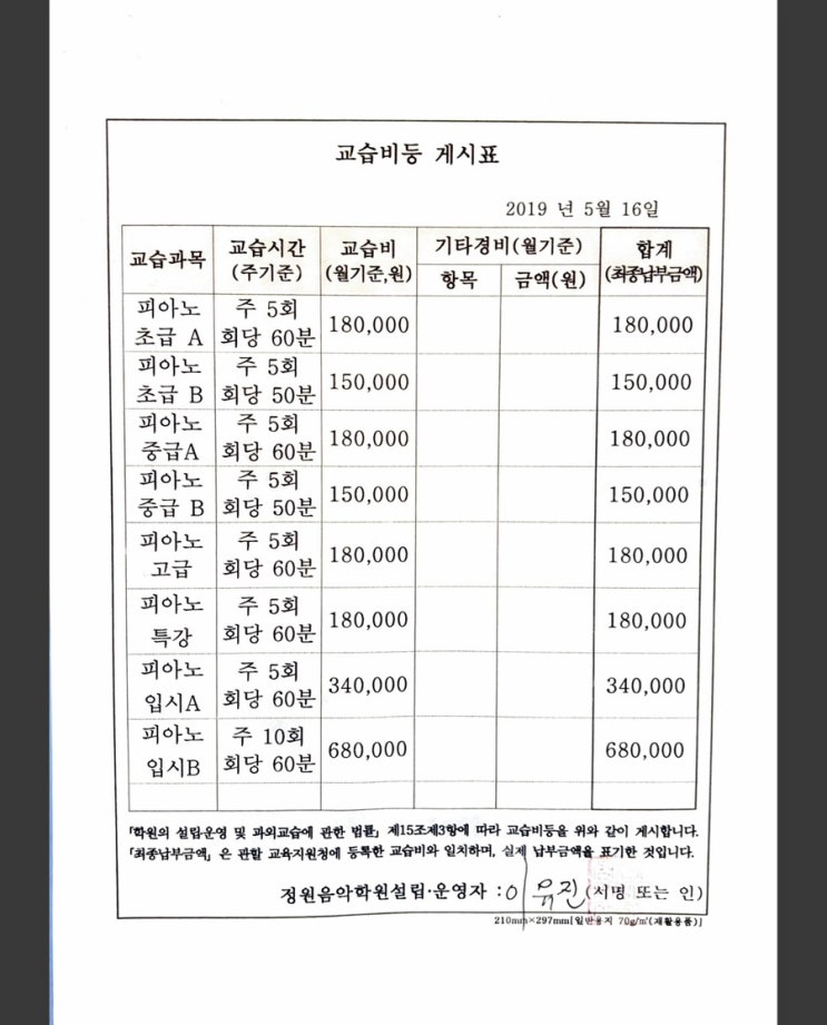 안녕하세요, 정원음악학원입니다. 저희 학원은 학부모님과 학생 여러분께 신뢰받는 교육 환경을 만들기 위해 교습비를 투명하게 공개하고 있습니다. 아래는 현재 운영 중인 과목별 교습비 안내표입니다. 교습비는 수업 시간, 수업 형태, 레벨 등에 따라 다소 차이가 있을 수 있으며, 자세한 상담은 학원으로 문의해 주시면 친절히 안내드리겠습니다. 정원음악학원은 학생 개개인의 음악적 성장과 즐거운 배움을 최우선으로 생각합니다. 앞으로도 변함없이 좋은 교육으로 보답하겠습니다. 상담 및 문의 010-3596-1849 <img src="https://blogthumb.pstatic.net/MjAyNTExMTFfMTEw/MDAxNzYyODM3ODAzNjgx.iRuT-0OKIxj2RzVCz4Bx-p-zApFYm6EgMBLPASxjaXcg.MAoosGKiIjeVF4dBDWeHUzP5lFxdrDCNnIBFqgF1c3Eg.JPEG/IMG%A3%DF6573.jpg?type=s3" />