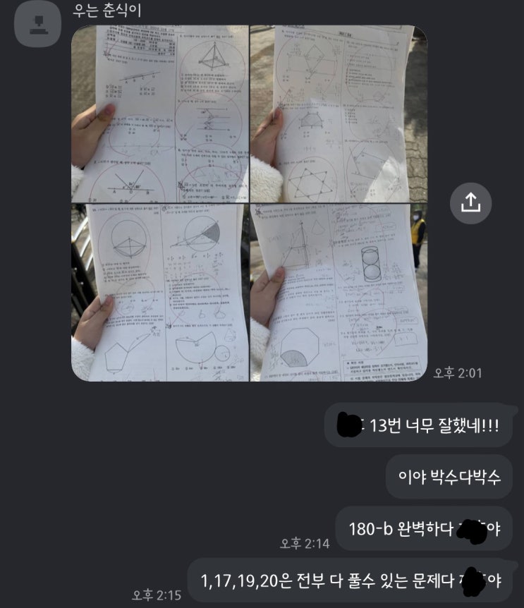 안녕하세요, 언더스탠수학학원입니다 11월은 중1 친구들이 14년만에 처음으로 학교에서 시험을 치르는 달이었습니다. 평소에 긴장안하던 친구도 시험 전날은 많이 긴장하기도 하고, 안하던 실수를 하기도, 걱정을 하기도 했는데요! 이런 모습은 결국 첫시험을 잘보고 싶은 마음에서 나오는 자연스러운 현상입니다! 응원과 지금까지 해왔던 것처럼 마무리 준비를 시켜줬습니다. 중1 친구가 이번시험을 보고 나눈 카톡입니다. 시험 전날까지 계산실수가 보이고 걱정이 되는 부분이 있었습니다. 그래서 '70점 받아도 정말 잘 받은 점수겠구나' 라고 생각을 했는데, 시험지를 보니 정말 열심히 풀어와서 놀랬습니다 ㅠㅠ 계산실수도 없고 평....... <img src="https://blogthumb.pstatic.net/MjAyNTExMjVfMjE1/MDAxNzY0MDYwMjYwNjIx.shCi0BV6HAnwf7Ah-IZ0xkbXh86ksx8E_o0r5_obSmUg.ueMhx0vcvXNbhQ-_gYhuwJRD5MYyM5QJOYE3I61lepQg.JPEG/KakaoTalk_20251125_174159444.jpg?type=s3" />