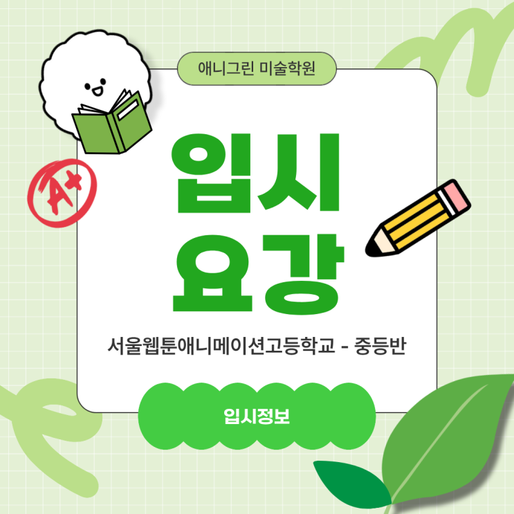 안녕하세요! 애니그린 미술학원입니다~ 오늘은 최근 인기가 급상승하고 있는 고등학교인 서울웹툰애니메이션고등학교를 소개해 드리려고 해요~ 서울웹툰애니메이션고등학교는 저희 애니그린 중등 입시반 학생들도 지망을 했었답니다. 입시 기간마다 긴장된 얼굴로 시험장에 들어가는 학생들을 보면 그동안의 노력과 성장이 자연스럽게 떠오르곤 하죠. 서울 웹툰 애니메이션 고등학교는 점점 경쟁률이 높아지고 있어 결과가 나올 때면 매번 학원에서도 긴장하곤 하죠. (◞‸◟;) 이처럼 많은 학생들이 도전하고 싶은 학교, 서울웹툰애니메이션고등학교(서웹고) 2026학년도 입시요강을 정리해 드리려고 해요! 지원 자격부터 평가 방식, 실기 특징....... <img src="https://blogthumb.pstatic.net/MjAyNTExMjVfMjE5/MDAxNzY0MDY4MDA4NjYy.fgc1xCLDJqREzI9nbhO2KYz4MjCaKun0A3b0K3JKXAIg.O7Jr6J3KZNr_ES-zmDvZqVGvxV170X-2Uz9eXY-eZjMg.PNG/%C1%A6%B8%F1%C0%BB_%C0%D4%B7%C2%C7%D8%C1%D6%BC%BC%BF%E4._%281%29.png?type=s3" />