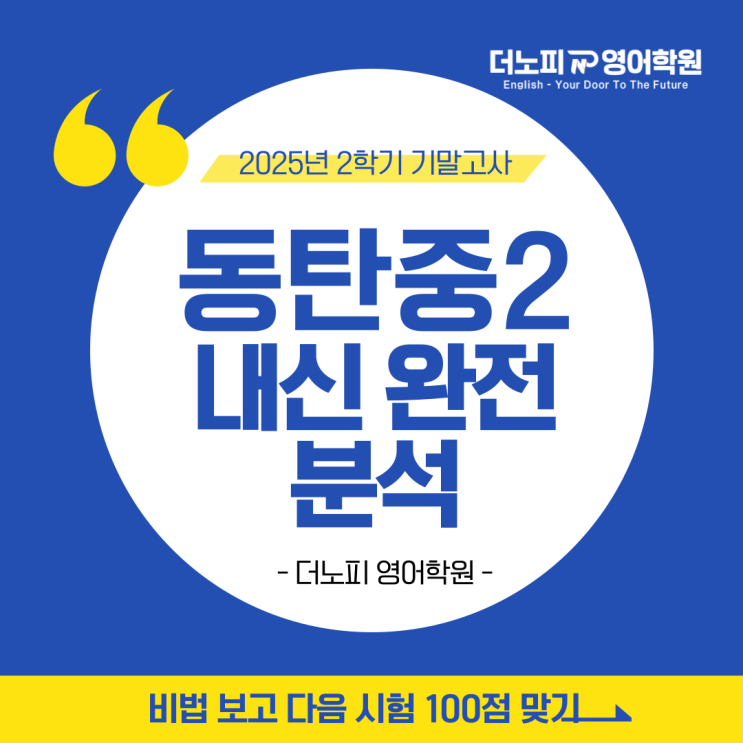 안녕하세요, 더노피 영어학원입니다. 동탄중학교 2학년 친구들의 기말고사가 끝이 났습니다~! 우리 친구들 모두 고생 많았습니다 :) 동탄 2에 위치한 동탄중학교 2학년 2학기 기말고사 분석을 해보려 합니다. 함께 살펴보시죠 ! 동탄 동탄중학교 2학년 2학기 기말고사 문제 유형 분석 동탄중 2학년 2학기 기말고사 출제분석 이번 시험 역시나 외부지문의 비중이 높고, 외부지문과 본문의 추론, 내용일치와 그 안에서의 어법 관련 출제가 이루졌음을 알 수 있습니다. 동탄중 2학년 2학기 기말고사 시험총평 2025년 동탄중학교 2학년 2학기 기말고사 시험총평 이번 내신 시험 역시 교과서 본문에 국한되지 않고, 외부 지문과 본문 외 교과서 지문까....... <img src="https://blogthumb.pstatic.net/MjAyNTEyMTVfMjk2/MDAxNzY1NzkwMzYzNzI0.7T3nu0b4syoGRU10n0NjjJikW0FgPLBssNbCLqxTzVAg.WF_jwZ0ROKvVBgMnN0VSPTDEZtmoVugGmLzzbFKh4_sg.PNG/001.png?type=s3" />