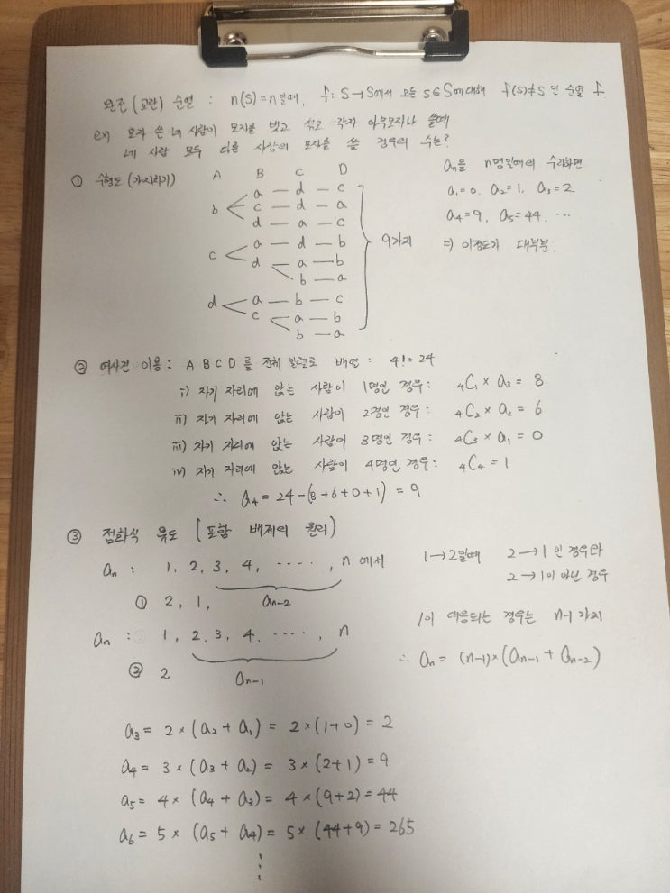 완전(교란) 순열은 예전의 교육과정 이산수학에 분류되는 경우의수인데, 일명 노가다 로 불리는 귀찮을 수 있는 문제들입니다. 하지만 실전 시험에서는 미리 암기해 두고 있거나 다양한 해법들을 익혀두고 있으면 시간도 절약하며 실수없이 적용시킬수 있어요. 무작정 암기보다는 원리와 함께 미리 익혀두기를 추천합니다! <img src="https://blogthumb.pstatic.net/MjAyNTEyMjBfMjEz/MDAxNzY2MjA5MzA2Mjg3.KsZxvDodXjwcBlfzr_0ntKFpgiPQXybB1_zntzUv2m4g.NUOAWByK4Tk5eseN_mGcBm7YuKaVuB5d18hzma4CLzMg.JPEG/900%A3%DF20251220%A3%DF143625.jpg?type=s3" />