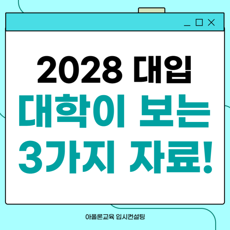 2028 대입 대학이 보는 3가지 자료! 안녕하세요, 대치아폴론의 최동선 소장입니다. 겨울방학, 많은 학생들이 “조금 쉬어도 되지 않을까” 생각하지만, 사실 지금은 입시 구조를 읽어야 하는 시기입니다. 특히 예비고1·2라면 반드시 체크해야 할 변화가 있습니다. “대학에 새롭게 제공되는 3가지 전형 자료” 이걸 정확히 이해하지 못하면, 지금 1.0등급을 받아도 원하는 곳에 가지 못할 수 있습니다. 왜일까요? 9등급제의 마지막, 5등급제의 시작 2027 대입이 9등급제의 마지막입니다. 2028 대입부터는 내신 5등급제가 본격 적용됩니다. 등급 간 간격이 넓어지면 어떤 일이 벌어질까요? 대학 입장에서는 같은 등급 안에서 학생을 가려내야 하는....... <img src="https://blogthumb.pstatic.net/MjAyNjAyMjRfMjA1/MDAxNzcxOTA5ODY0NjU5.ja2dRavAopCDxBwto0fA2Rd9e7K8MEbYHmdomG4j-0Yg.nYszyRWhIqNbsmT47ym9hliHM4hhwbMFYcY3egPdY8wg.PNG/%BA%ED%B7%CE%B1%D7_%BD%E6%B3%D7%C0%CF%28%B0%A1%C0%CC%B5%E5%BC%F6%C1%A4X%2C_%C6%E4%C0%CC%C1%F6_%BA%B9%BB%E7%BB%E7%BF%EBO%29-003_%287%29.png?type=s3" />