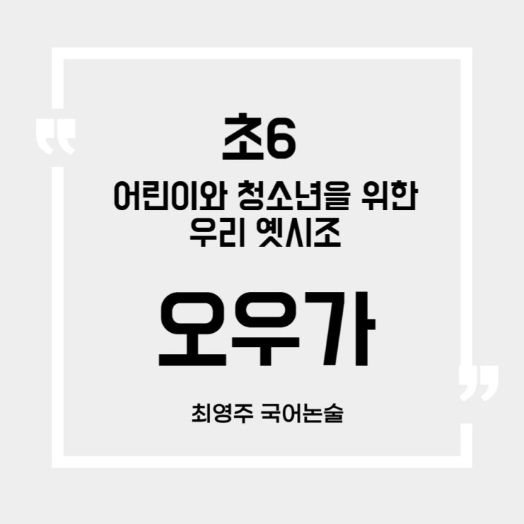 학습목표 1. 조선의 옛 시조에 관한 책을 선택하고 독서하며 시조의 개념과 종류를 익힌다. 2. 조선의 다양한 옛 시조를 감상하고 그 중 인상 깊었던 시조를 선택한다. 3. 선택한 시조에 대해 깊게 탐구하며 당시 시대상과 당시의 문학을 이해한다. 4. 이해한 내용을 집약적으로 정리하여 한 장의 독서록으로 작성한다. 수업 내용 Ⅰ 칭찬할 점과 이후 학습 계획 우선, 책의 핵심을 정확하게 파악하였습니다. 시조 '오우가'의 핵심 소재인 다섯 자연물과 그 의미를 정확하게 연결하였습니다. 이를 통해 당시의 대표적인 관습적 상징들을 파악할 수 있었을 것입니다. 이는 고려 중기에 생겨나 현재까지 창작되고 있는 우리 고유의 정형....... <img src="https://blogthumb.pstatic.net/MjAyNjAyMTBfMjAx/MDAxNzcwNzE3MjE2MTAy.A-38pGFvE58Y8zwZhwOmASAihI2LsUswS5eU5nh7bN4g.GTRXRat03RjAZhw-rzA5Lpd1vMX5o9Lv2zZqmj2rkWEg.JPEG/%BA%ED%B7%CE%B1%D7_%BD%E6%B3%D7%C0%CF-001_%281%29.jpg?type=s3" />