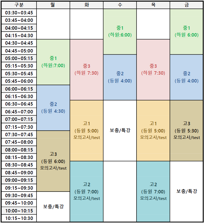 2026년 영자감 수업 시간표 ※ 배방중, 배방고 방과시간을 고려한, 학기중 시간표입니다. ※ 방학중에는 방학 시간표를 참고바랍니다. 영자감의 수업 운영은 "정규 수업"과 "강화 학습"으로 진행됩니다. ◆ 정규 수업은 그룹 강의식 수업이며, 전강의 프리젠테이션 강의기법을 활용하여 원장 직강으로 운영되고 있습니다. 정해진 시간표 시간에 맞춰 운영됩니다. ◆ 강화 학습은 정규 수업 전후 workbook, 모의고사나, 독해 학습, 단어암기 등 역량 강화를위한 학습입니다. 정해진 시간동안 운영 되는 것은 아니며, 학생의 충분한 학습이 확인이 되면 마치게 됩니다. 배방중1 하교 후 바로 등원 합니다. 정규 수업후 약 1시....... <img src="https://blogthumb.pstatic.net/MjAyNjAyMjdfMjY3/MDAxNzcyMTYzOTA3NDM3._oglB3Tq9yjxXd3FdAu0As-OCe0vL1h1aSMkjiZa-lYg.p2ELvkb9412sLbOSOvbUln2zjWjaHeivxWvNHcRC7_Eg.PNG/%BF%B5%C0%DA%B0%A8_%BD%C3%B0%A3%C7%A5.png?type=s3" />