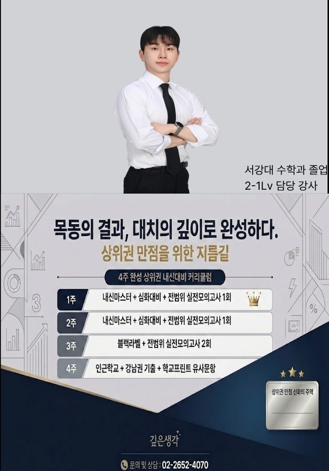 개강일 : 26년 4월 1일 ~ 5월 1일까지 (총 14회) 요일 및 시간 : 월,수,금 / 오후 5:00 ~ 8:30 (주3회. 3시간 반) * 입학조건 : 상위권 내신대비반 입학테스트 통과학생 (입학테스트 필수) 30문제 / 90분 <img src="https://blogthumb.pstatic.net/MjAyNjAzMDNfMjc4/MDAxNzcyNTIyMjAxODky.oXuOm9hBNw1ob0Be5EggACkTI0CH7maA5zkxVBd_VQYg.A0AHyutjVA9wJBy2rXTXJjxaZQyU5a4kuFjh9dxix7Ig.JPEG/KakaoTalk_20260303_134103410.jpg?type=s3" />