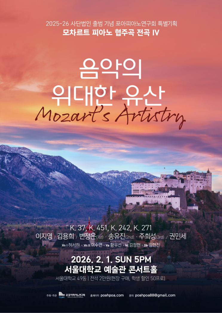 드디어 지나가지않을것같던 2월을 불태우고 3월 개강주가 지나가네요.. 방학을 연주 3개 준비로 열심히 불태운거같아요! 그 중 두개의 연주가 2월에 있었답니다. 2월의 첫날에는 모차르트 콘체르토 2월의 마지막날의 전날(?) 에는 투피아노 듀오 리사이틀 그래서 사실 2월은 기록할거는ㅋㅋ많이없답니다 벼락치기 준비라 연휴도 반납하며 연습룸에만 있었거든요. 2월의 첫째날에는 서울대학교 예술관에서 모차르트 피아노 콘체르토 연주가 있었어요. 서울대 예술관에서 마지막 박사학위 리사이틀 이후로 오랜만에 무대를 서는거라그런지 느낌이 색다르더라구요. 사전 리허설 한번 당일 한번 딱 두번만으로 리허설을 하고 한 연주여서 살얼음판같....... <img src="https://blogthumb.pstatic.net/MjAyNjAzMDdfMTI1/MDAxNzcyODcwNDQwOTkx.0KiugscvqkdHfGJRnUJvn0WBtSvtkM_ej7Op-V1B2VYg.bIR9B8cxqdrR_eoq7EVDTK326C8uxfGPHcE20u7lo3cg.PNG/IMG%A3%DF4978.PNG?type=s3" />