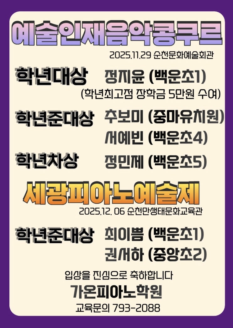 2025 호남문화예술제 피아노 콩쿠르 우리 친구들 12명 전원 수상! 감동의 순간을 기록합니다 2025년 11월 15일, 호남문화예술제 피아노 콩쿠르에 우리 음악놀이터 친구들 12명이 참여했습니다. 오랜 시간 꾸준히 연습해온 만큼, 아이들은 이날 유난히 빛나는 무대를 만들어 주었어요. 그 결과, 놀랍게도… 참가한 12명 모두가 수상이라는 값진 결실을 이루었습니다! 유치부 대상 – 1명 (학년대상과같은상이예요 유치부1등!!!!) 문화예술대상 – 11명 유치부 7세 3명 , 1학년 1명, 2학년3명 4학년 1명, 5학년 1명, 6학년 3명 무대에서 긴장되면서도 집중하는 아이들의 모습, 연주가 끝나자마자 환하게 웃던 얼굴들, 그리고 발....... <img src="https://blogthumb.pstatic.net/MjAyNTExMjVfMjY0/MDAxNzY0MDM2NTAwMDc5.1MKgeZyUMxaXDYpRsGVYkNryQWusfH5AqnDYmWWY49sg.97F4uklb3sQSX6KVWDja-8THetaekQGd9DkToP7r8Zwg.JPEG/900%A3%DF20251121%A3%DF132025.jpg?type=s3" />