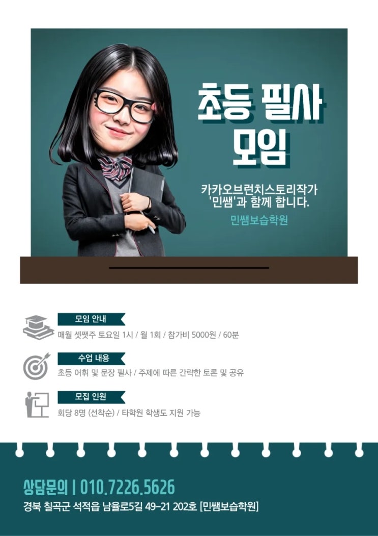 #초등 #필사모임 ㆍ ㆍ 카카오 브런치스토리 작가 '민쌤'과 함께 필사하는 모임 입니다. ㆍ ㆍ 초등학생 친구들이면 누구나 참석 가능. 매월 1회 / 토요일 / 회당 참가비 5000원 접수문의 : 010.7226.5626 ㆍ ㆍ #민쌤보습학원 #민쌤스토리 #석적학원 #석적논술 <img src="https://blogthumb.pstatic.net/MjAyNjAyMjZfMTA0/MDAxNzcyMTAzNzAwNjcz.ljnJOmk1-YmCjGJPI_MbiBS1UijjmnWwFyutkLMHWkQg.pHWahvKptApvSLu398OOgwpp3iUQAAB5beWk6UzRh1Mg.JPEG/900%A3%DFea404172%A3%AD1082%A3%AD44f3%A3%AD9e6c%A3%AD8cb7d7b064a7.jpg?type=s3" />