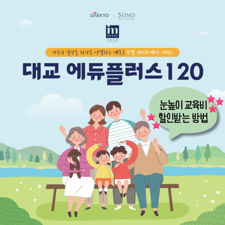 "대교 에듀플러스 120" 매월 4만원씩 30개월간 눈높이 교육비 최대120만원 할인받고 대명 라이프 멤버쉽까지~!! 1인당 최대 4구좌까지 선택 가능 4구좌 선택시 16만원씩 30개월 총 480만원 혜택~!!! 대명소노그룹 멤버쉽 혜택 (전국 소노그룹 및 부대시설 우대할인) 하이브리드 서비스 (해외여행/크루즈여행/어학연수/웨딩/상조-택1) 만기 후 납입금 전액 환급 100% (단, 하이브리드 서비스 미용시) 눈높이 학습중이거나 눈높이 신규회원 등록시 신청 가능~!! ( 단, 눈높이 제품 4만원 이상에만 혜택 적용) <혜택 상세 안내> <대명 소노그룹 프리미엄 서비스 혜택> <하이브리드 서비스> (5가지 중 택1 가능,서비스 이....... <img src="https://blogthumb.pstatic.net/MjAyNjAxMjhfMTg3/MDAxNzY5NTkzNjAxMzk5.Z1vMT5OzZjhYzOnwBJ_NmwiJ5XnrDHyV3JB8nvby1E4g.s444V67qg3XB8wBseernGvS3cd8oOkP7f2gz5Xdgjo4g.PNG/001.png?type=s3" />