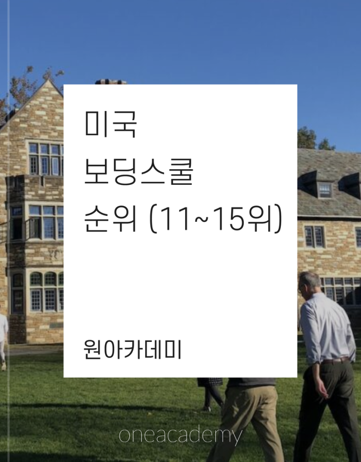 미국 보딩스쿨 순위 (11~15위) by. 압구정 원아카데미 (02-501-5590) 안녕하세요, 보딩스쿨 · 미국대학 전문 압구정 원아카데미 입니다. 오늘의 글에서는, 2026년 Niche 랭킹 기준 미국 보딩스쿨 종합 순위를 안내드리려고 합니다. 이번 글에서는 11~15위까지의 학교들을 먼저 소개하고, 다음 글에서는 16~20위의 학교들을 안내드릴 예정입니다. 보딩스쿨 랭킹은 평가 기관과 기준, 그리고 연도에 따라 비교적 유동적으로 변동되기 때문에, 순위 자체를 절대적인 기준으로 받아들이기보다는 각 학교가 지닌 교육 환경과 고유한 색깔을 이해하는 참고 자료로 활용하시는 것이 바람직합니다. 그럼 아래에서 학교별로 하나씩 살펴보겠습니다. 11위: ....... <img src="https://blogthumb.pstatic.net/MjAyNjAyMDRfMjg1/MDAxNzcwMTc4OTc2Nzc2.kVCGWEidEUgcf_qNMlxDoXeHyc6MLY8iSFoWuqITY7Eg.h2IitTJfgjRblgAugtBQxgFZTF7nvyQj5RjgK96AAHMg.PNG/%BA%F1%B1%B3%B0%FA_%C8%B0%B5%BF_%281%29.png?type=s3" />