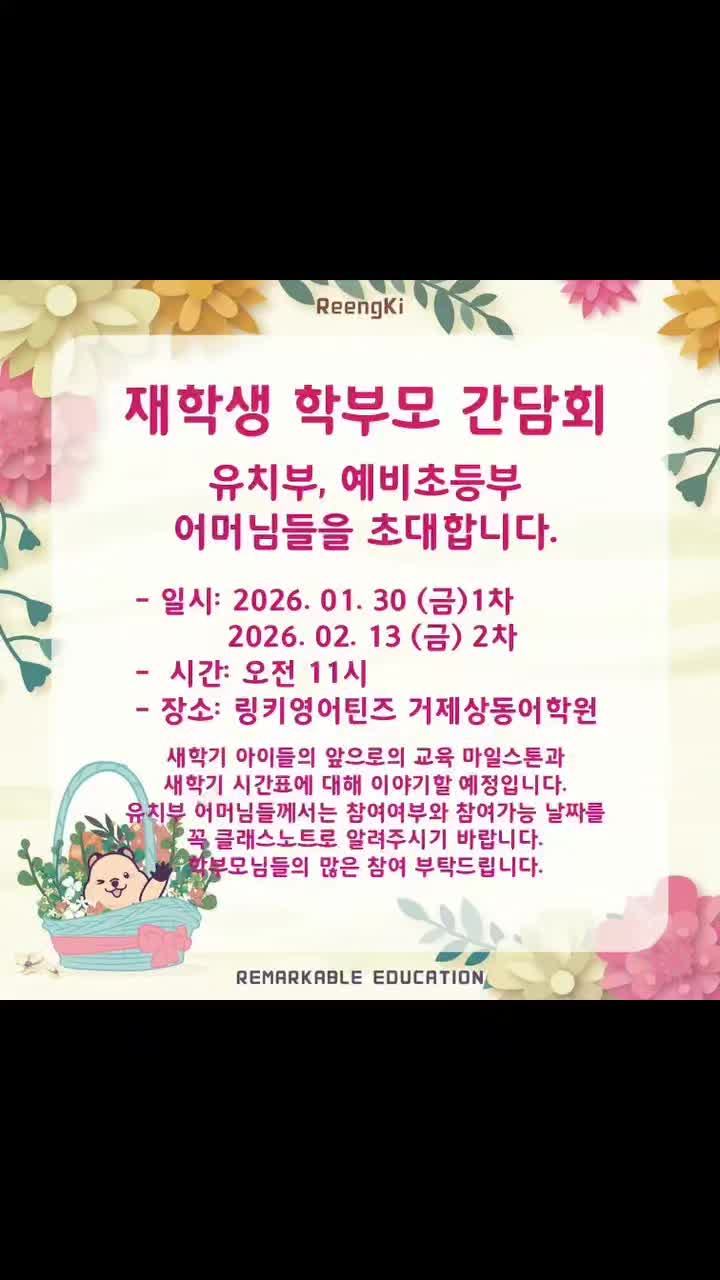 재학생 학부모 간담회를 엽니다! 아이들 영어 교육 플랜과 새학기 시간표에 대해 이야기 할 예정입니다. 키즈노트(클래스노트)로 꼭 참석여부를 알려주세요! 아이들의 미래를 위한 소통의 장이오니 많은 참여 부탁드립니다! <img src="https://phinf.pstatic.net/image.nmv/blog_2026_02_04_3077/Pd54X9YMlI_01.jpg?type=f480x480" />