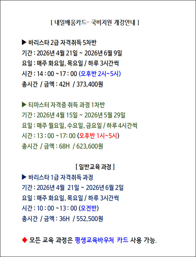 내일배움카드 (국비지원) 사용하시는 분들은 사전에, 고용 24 홈페이지를 통해 수강 신청을 부탁드립니다. https://www.work24.go.kr/cm/main.do 일반과정 관련해서는 전화로 신청 접수가 가능합니다. <img src="https://blogthumb.pstatic.net/MjAyNjAzMTlfMjU2/MDAxNzczODgwOTYxNjUy.E2mayhkM4QR91Z1o08tsLIWzRvpPNChYivxVyftDno4g.jigAjFz59tER9nL37AmwvsXP1AU5wDhHR9wqexyz6bcg.PNG/4%BF%F9_%B0%B3%B0%AD_%B0%AD%C7%F6%C1%D6%B9%D9%B8%AE%BD%BA%C5%B8%C7%D0%BF%F8.png?type=s3" />