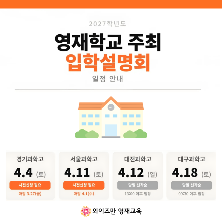 즐거움, 깨달음, 감동이 있는 창의사고력 수학·과학 와이즈만 영재교육입니다. 2027학년도 영재학교 입시 레이스가 본격적으로 시작되었습니다. 3월 중순 설명회를 마친 한국과학영재학교에 이어, 인천과학예술영재학교 설명회 사전 신청이 마감되었으며 경기·서울·대전·대구 등 영재학교의 설명회 일정이 공개되고 있습니다. 2027학년도 영재학교 주최 설명회 일정 및 신청 방법을 안내드립니다. 정확한 내용은 아래 링크를 통해 각 영재학교 홈페이지에서 직접 확인해 주세요. 2027 영재학교 주최 입학설명회 일정 안내 경기과학고 입학설명회 *참석신청 마감 3.27(금) 17:00 - 1인당 최대 2명 입장 (학생+보호자, 학생+학생, 보호자+보호자 모....... <img src="https://blogthumb.pstatic.net/MjAyNjAzMjZfNjAg/MDAxNzc0NDkzODIwNTE3.6J1Zs7HHKcYaI1TQmYV3d_RyA0LWVymaGpa_ypa-SM0g.9OeGMRwjmq5UQNED2I3TxqtzfMHlJGXc3wIAst5DKgsg.PNG/%C1%A6%B8%F1%C0%BB_%C0%D4%B7%C2%C7%D8%C1%D6%BC%BC%BF%E4._%2847%29.png?type=s3" />