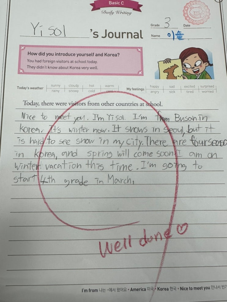 요즘 학부모님들 상담을 하다 보면 “초등 저학년인데 영어로 글을 쓸 수 있나요?” 라는 질문을 정말 많이 받습니다. 단어 외우기와 문제 풀이만으로는 아이들이 자기 생각을 영어로 표현하는 힘이 자라기 어렵습니다. 그래서 삼성영어셀레나 명지더샵2단지에서는 Creative Writing을 꾸준히 진행하고 있습니다. 한국을 소개하는 이솔의 저널 라이팅 외국 친구들에게 한국을 소개한다는 상황 속에서 부산의 날씨, 계절, 학교 이야기를 자연스럽게 담았어요. 특히 실제 말하듯 편안하게 쓰는 모습이 인상적이었고, 초등 3학년임에도 내용 구성이 매우 안정적이었습니다. 명지 초등영어 학부모님들이 많이 말씀하시는 “우리 아이 말은 잘하....... <img src="https://blogthumb.pstatic.net/MjAyNjAyMjFfMTA4/MDAxNzcxNjQzNjU5MzE5.sKY1Pc78YIxbsQiB3ioR7yb6vZo4sDRajv4afn2aopYg.283Tb-GINlfFVjQIcIInjw2_4IZynaxBV7b-ir_jDxwg.JPEG/IMG%A3%DF7623.jpg?type=s3" />