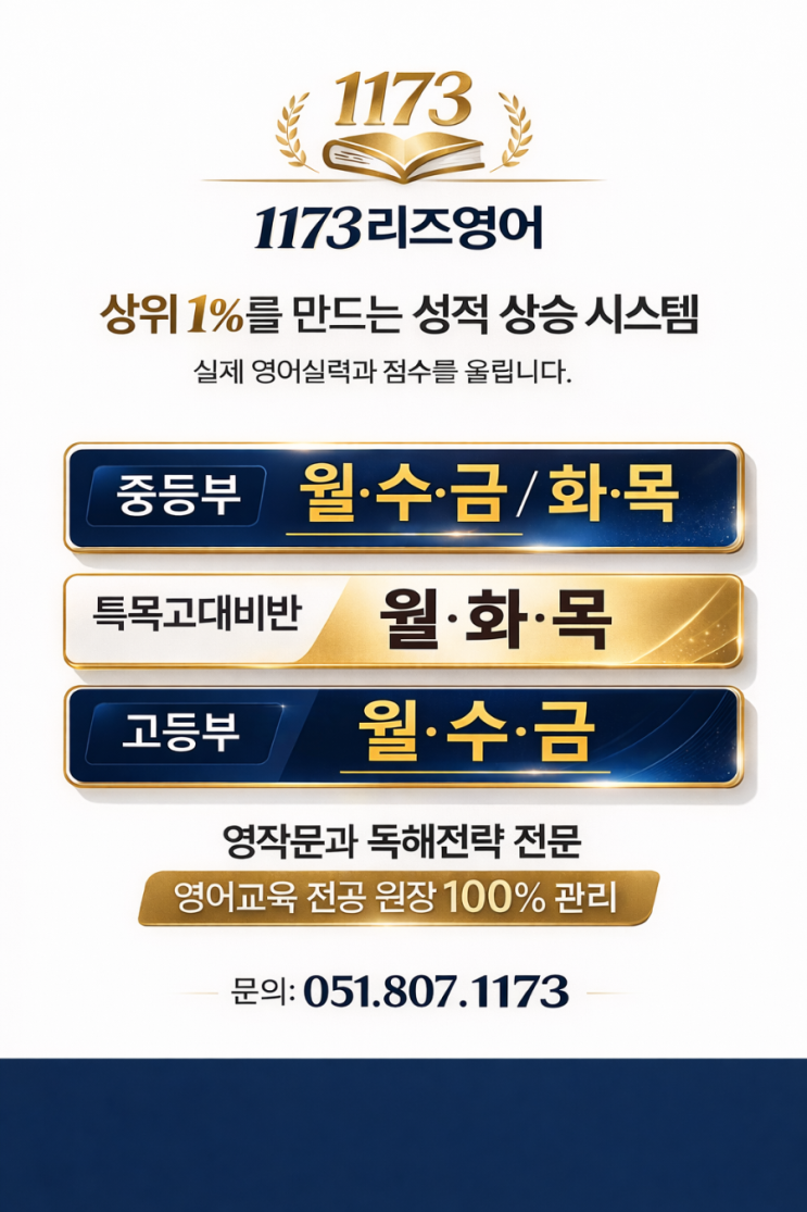 왜, 1173리즈영어는 다를까요? 서·논술형 평가는 점점 확대되고 있습니다. 내신은 물론, 2030년대 수능에서도 서술형·사고력 중심 문항이 강화될 것입니다. 지금 필요한 것은 외우는 영어가 아니라, 쓰는 영어입니다. ✔ DOs : 리즈가 하는 교육 1. 영어 서·논술형 수업 중심 → 단답형이 아닌, 생각을 정리해 쓰는 훈련 2. 철저한 채점 후 오답노트 시스템 → 왜 틀렸는지 분석하고 다시 쓰게 하는 구조 3. 문장을 통한 단어 습득 → 단어를 ‘뜻’이 아니라 ‘문맥’으로 이해 4. 독해전략 수업 (유형별 + 속독 훈련) → 구조 분석 능력 강화, 문제 풀이 기술이 아님 5. 스스로 공부할 수 있는 습관 훈련 → 학원 의존형이 아닌 자기주도 학습....... <img src="https://blogthumb.pstatic.net/MjAyNjAyMjRfMTY1/MDAxNzcxODkwNzQ3OTkx.1up0bOIH3Tu4Af1NgrlprlnsLNtBL9dTvTtQbreyyKwg.XhODvwTqIqjFToZlLJFdgDVUh8w1ucX3ARy4HOC_91Ig.PNG/900%A3%DFfile%A3%DF00000000fff07208b3bfe39776e783cf.png?type=s3" />