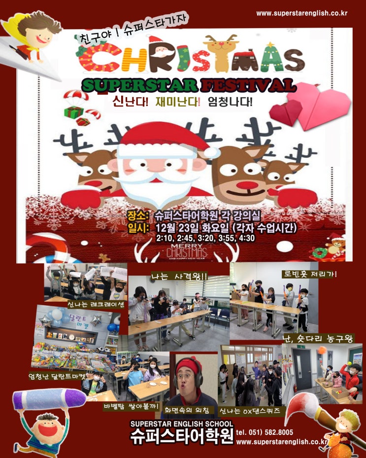 안녕하세요, 슈퍼스타어학원입니다. 한 해 동안 아이들이 보여준 노력과 성장에 감사한 마음을 담아, 올해도 따뜻한 연말 선물 같은 크리스마스 파티를 준비했습니다. 아이들이 마음껏 웃고 즐기며 “학원은 나를 응원해주는 곳”이라는 기억을 품고 돌아갈 수 있도록 정성을 다해 준비했어요. 왜 이 행사를 준비했을까요? 올해 아이들의 일상을 돌아보면, 학교, 숙제, 학원… 참 많은 것들을 꾸준히 해내며 성장해왔습니다. 그 노력에 보답하고 싶었습니다. ✔ 쌓였던 스트레스를 함께 풀고 ✔ 한 해의 성장을 축하하며 마무리하고 ✔ 친구·선생님들과 더 깊은 친목을 쌓는 시간 이번 파티는 단순한 이벤트가 아니라, 아이들에게 ‘쉼표’....... <img src="https://blogthumb.pstatic.net/MjAyNTEyMTBfMjEx/MDAxNzY1MzMzNDE5MzY5.MpBRa8T703CitdXALJ8juCa_r5XEI3DAcwJgUq925Xwg.UI9xeTcDr2HcQ4cgpVtvETxqxx1_CI3b36EQ311L-jAg.JPEG/%C3%CA%C3%BB%C0%E5%282025.12%29.jpg?type=s3" />