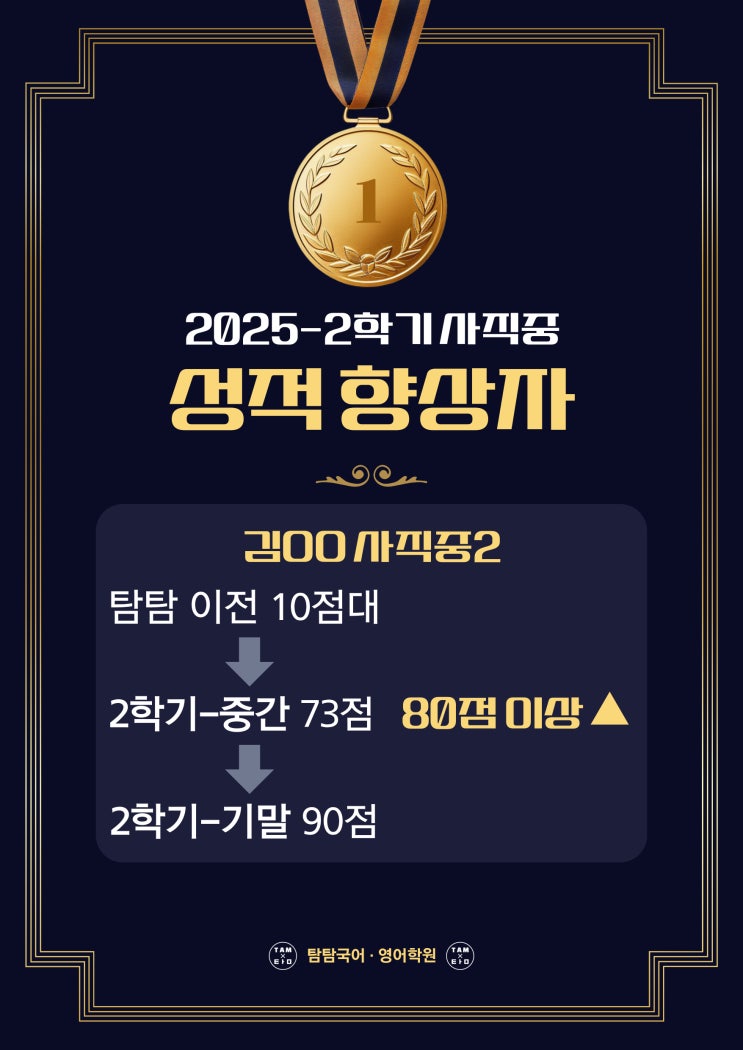 수업준비와 재원생들 학습 케어로 바쁘게 지내다 보니 정말 오랜만에 블로그에 글을 쓰네요 ㅎㅎㅎ 바삐 지내는 동안 아주 좋은 소식이 있었는데요~ 저희 원에 처음 왔을 때 영어 점수가 10점대였던 학생이 이번 2학기 기말고사에서 90점이라는 쾌거를 거뒀습니다!!!!!!!! 가이드대로 너무나도 잘 따라와 준 친구였습니다. 그로 인해 본인 스스로가 하면 충분히 된다는 자신감을 가지게 됐고 더욱더 영어 학습에 관심과 재미를 느끼게 되었습니다. 수업 관련 문의는 T. 051-715-1255 혹은 H. 010-6429-4642로 연락 주시면 됩니다. 방문 예약은 미리 연락 주시면 안내해 드리겠습니다. #사직동학원 #동래학원 #사직동국어 #사직동영어 #동래국어 #....... <img src="https://blogthumb.pstatic.net/MjAyNTEyMTdfMjQy/MDAxNzY1OTgzMjgwNzk5.zP4qrCvDbND0khSqOfSK7tB4Yck0cmHEnSwooeEy2f0g.AAq4Ay9kGe9WgG0_T5NS-LnJ6pYuzLd2RHqyyoHBI9gg.JPEG/005.jpg?type=s3" />