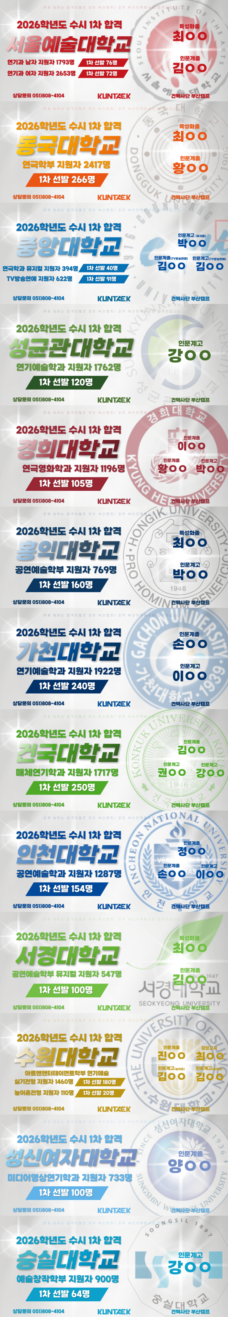 건택사단 부산캠프만의 결과 2026학년도 수시1차 합격자 대공개❗️ 기다린 소식, 드디어 공개합니다 말이 아닌 결과로 증명해냈습니다 과정 속 멋진 배우로 성장해낸 우리 자랑스러운 건택사단 부산캠프 친구들 너희와 함께 한 2025년 너무 행복했다 더 많은 합격 소식이 있으니 기다려주세요 곧 돌아옵니다 coming soon... ☎️건택사단 부산캠프 상담 문의 051)808-4104 건택사단 공식 홈페이지 http://ktcamp.net . . 건택사단 부산캠프 공식 인스타그램 http://instagram.com/kuntaek_busan . . 건택사단 부산캠프 카카오톡 ktcamp97busan <img src="https://blogthumb.pstatic.net/MjAyNTEyMThfMzIg/MDAxNzY2MDUxNjkyODM2.2CcSEv-k3CQyz-zr7rzdJpv8-pOdDVQuugtb9l0G6mAg.KWrsm-FxYRRvhuWXZmAfE33g0QzqKyoFvlT6i5xVPngg.PNG/%BA%CE%BB%EA%C4%B7%C7%C1-%C7%D5%B0%DD%C0%DA_%281%29.png?type=s3" />