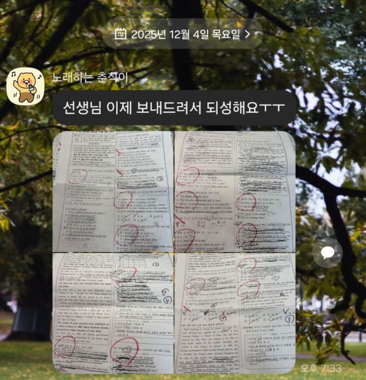 저와 공부한 지 고작 5주인데 성적이 무려 30점 상승한 학생이 있어 조금 자랑해봅니다 무엇보다 기분 좋은 건, 제가 시키는 방향 그대로 성실하게 따라와준 우리 학생의 노력이 결과로 증명되었다는 것! 정말 너무 대견합니다 ✨ 그리고… 작은 비밀 하나 더! 시험 전날 “이 부분 꼭 봐라!” 하고 보낸 내용이 이번에도 그대로 출제됐습니다 총 10문제 중 6문제 적중! 학생이 “쌤이 말한 거 진짜 나왔어요!”라고 말해 줄때마다 저도 혼자 미소 짓는답니다 <img src="https://blogthumb.pstatic.net/MjAyNTEyMDZfMTc0/MDAxNzY1MDE5ODczMzUz.tS2SmtIkbfOdN5-IMpMRJ7cblTkoqCRrhXanKeatZbog.4L1ZMf5FWS9QYHIzP8XX5ai7ZEsLTV--ID2RlDKBK9sg.JPEG/900%A3%DF1765019581867.jpg?type=s3" />