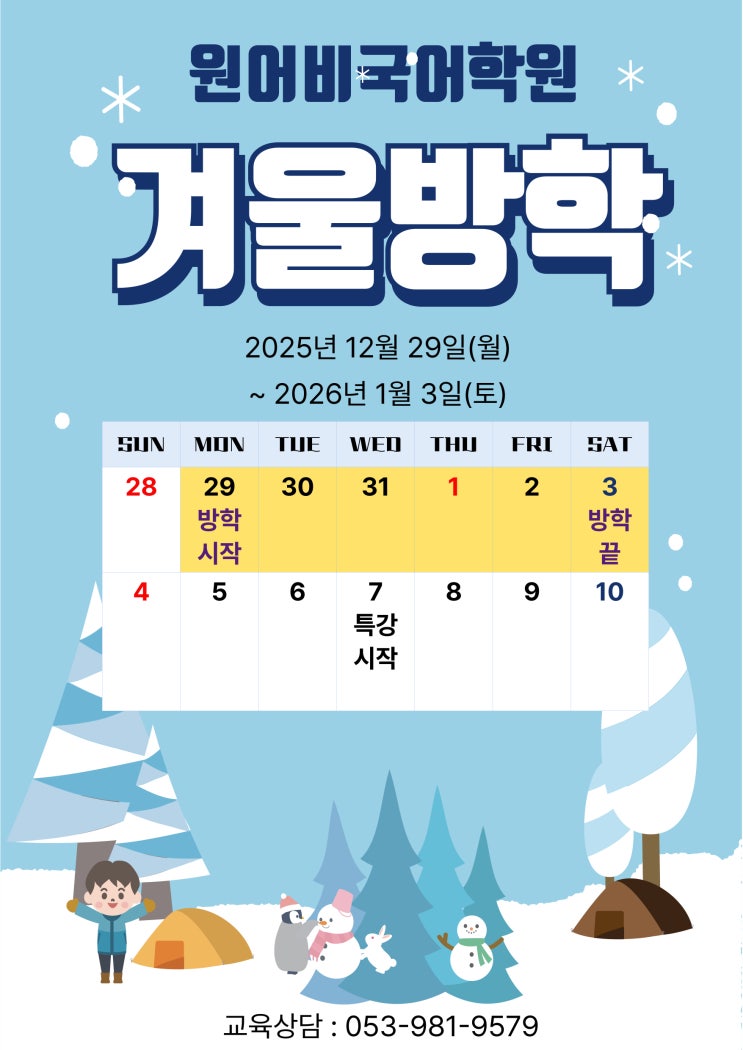 겨울방학 안내문 안녕하세요. 원어비국어학원입니다. 2025년 한해도 마무리가 되어가는 시기입니다. 소중한 인연으로 올 한해도 행복하고 따뜻한 한 해였습니다. 남은 12월도 마지막까지 잘 보내시고 다가오는 2026년에도 행운과 축복이 넘치는 한 해이기를 기원하겠습니다. 이번 겨울은 역대급으로 추위가 온다고 합니다. 항상 건강 유의하시길 바라겠습니다. 다름이 아니라 본원에서는 2025년 12월 29일(월) ~ 2026년 1월 3일(토)까지 휴식을 취하며 에너지 충전을 위해 휴원을 하고자 합니다. 한 해의 마무리와 시작을 쉬면서 한 해동안 있었던 일을 떠올리고, 새해에 대한 계획을 짜는 시간이 되었으면 합니다. 학부모님들께서는 학원의 휴식....... <img src="https://blogthumb.pstatic.net/MjAyNTEyMTZfMTQg/MDAxNzY1ODY3NzE4MTU0.8BjXKdS3_bkBzWNwAHjORLwyTitSxlqirU_DfqRKZKIg.7XoopNDzPntmhBJmkpr1SUQ0bKMBYAOLkAU5KTHhhqkg.JPEG/%B0%DC%BF%EF%B9%E6%C7%D0%C6%AF%B0%AD-%C0%FC%B4%DC-001.jpg?type=s3" />