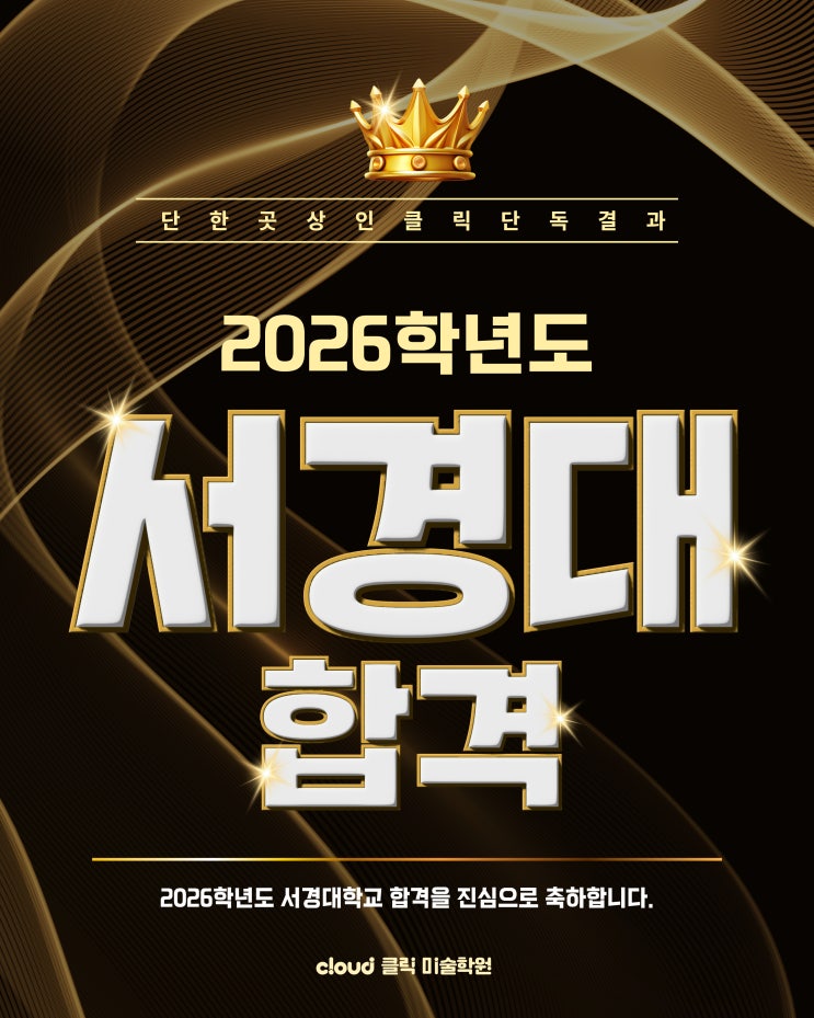 [ 2026 서경대학교 합격 ] 안녕하세요~ 대구미술학원 대구입시미술학원 상인동미술학원 달서구미술학원 신월성미술학원 상인클릭미술학원입니다~ 오늘은 2026 서경대학교 합격자 소식입니다. 2026 서경대 합격!! 정시 경쟁률 14.74 : 1 합격!! 정시모집인데도 불구하고 높은 경쟁률을 자랑하는 서경대학교입니다. 서경대학교는 정말이지.. 정시로 가는편이 훨씬 나을 수 있는 대학인데요. 물론 인서울에 모든대학들이 수시모집 보다는 정시모집으로 지원하는 편이 합격가능성이 높을 수 있죠. 왜 일까요? 다름아닌 경쟁률 때문입니다. 수시모집에서 인서울을 합격하려면 아마도.. 평균 35 : 1정도의 경쟁률을 뚫어야 합격 가능하죠. 모집인원은 적....... <img src="https://blogthumb.pstatic.net/MjAyNjAyMDNfOSAg/MDAxNzcwMDQ2NjIwNjMy.yMgRfbXF52nZnBE_CF1tIC_jdAtEv1K8bZeL62Nv7xUg.oE_C4bN65lzm4WiakCFKm5bF3VUReiMsHt79th2nEcIg.JPEG/%B4%EB%B1%B8%C0%D4%BD%C3%B9%CC%BC%FA%C7%D0%BF%F8_%281%29.jpg?type=s3" />