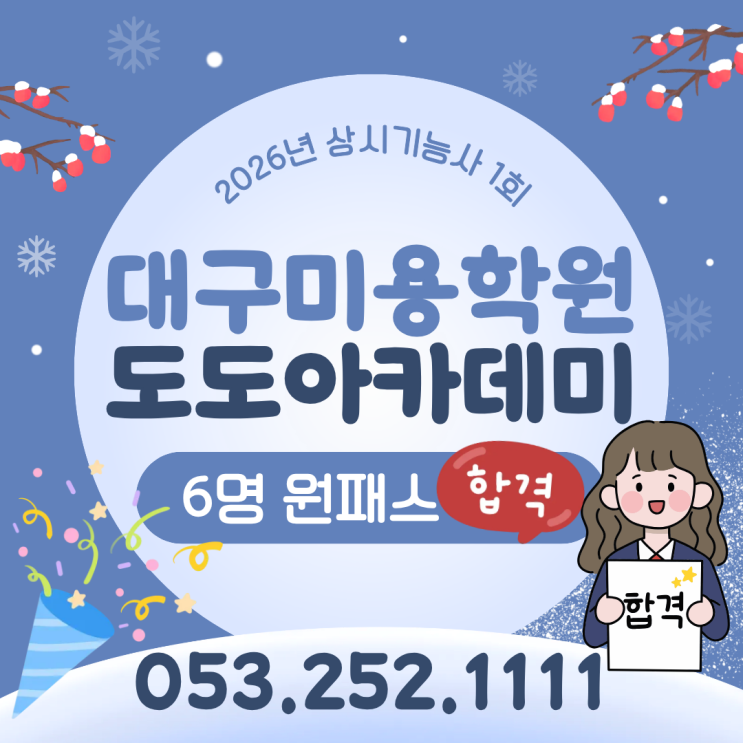 지난 2/5 목요일에 2026년 제 1회 상시 실기시험 합격자 발표가 있었습니다^^ 대구미용학원 도도아카데미 학생들이 아침 9시부터 줄줄이 합격소식을 전해왔어요~ 7명의 합격생 중에서 6명이 원패스!!! 1명은 2회차만에 합격이었지만 국가자격증을 네개째 합격하는 결과를 냈답니다~ 헤어, 메이크업, 피부, 네일 네 종목에서 골고루 합격생이 배출되었는데요, 오늘은 6명이나 원패스합격한 도도아카데미의 장점에 대해 알아보겠습니다. 대구미용학원 6명 원패스합격 도도아카데미 장점은? 합격으로 증명하는 도도아카데미의 노하우! 학생들의 후기에서도 볼 수 있듯이 "처음 시작할 때에는 생각보다 어려워서 점점 자신감이 떨어졌었는데, 선....... <img src="https://blogthumb.pstatic.net/MjAyNjAyMTBfNzMg/MDAxNzcwNzEyMDg1NzY5.krTBJOvGz2eBiaA4MF1TdZOUk8R4mE7Cv23LHYjItZYg.Fcswvh9Cf0YzpH4sJ2vHpaA5q2iLvaM9liDgfTIXWowg.PNG/%C1%A6%B8%F1%C0%BB_%C0%D4%B7%C2%C7%D8%C1%D6%BC%BC%BF%E4._%2840%29.png?type=s3" />