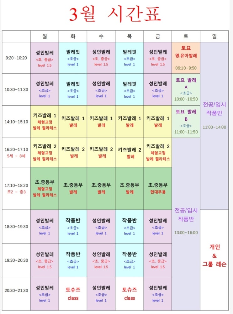 2026년 3월 시간표 / 수강신청 안내 입니다. ⚠️ 3월 2일 대체 공휴일은 성인반 수업만 있습니다. ⚠️ 등록 기간 : 2월 27일 금요일까지 (기존 회원 우선 등록 후 신규회원 인원 수 조정) ⚠️ 장기 수강이 끝나신 회원님께서는 별도로 문의 주시기 바랍니다. ⚠️ 성인반 정원 : 12명 (입금 선착순 마감‼️) 유. 초등부 정원 : 15명 ⠀ ✅ 3월 성인발레 수업 스케줄 ✅ ⠀ ✔ 성인발레 오전반 ✔ 3월 13일 금요일 개강 ~ 4월 9일 목요일 종강 ✔ 성인발레 오후반 ✔ 3월 13일 금요일 개강 ~ 4월 9일 목요일 종강 ⭕ 보강 수업 ⭕ 성인반 : 매주 토요일 오전 10시, 11시 보강신청은 매주 금요일 오후 6시까지만 받습니다~?....... <img src="https://blogthumb.pstatic.net/MjAyNjAyMjNfMTUz/MDAxNzcxODM4NDM5NjAz.IC8ML7NAfluh-mWccnYg10qFbHyoir3u1gCxBT1YH2kg.z2SIyB3ppTpdGqXGzhDjs9Gr92tfAPkEGXmdraY50xYg.JPEG/900%A3%DFScreenshot%A3%DF20260223%A3%DF181829%A3%DFPolaris_Office.jpg?type=s3" />