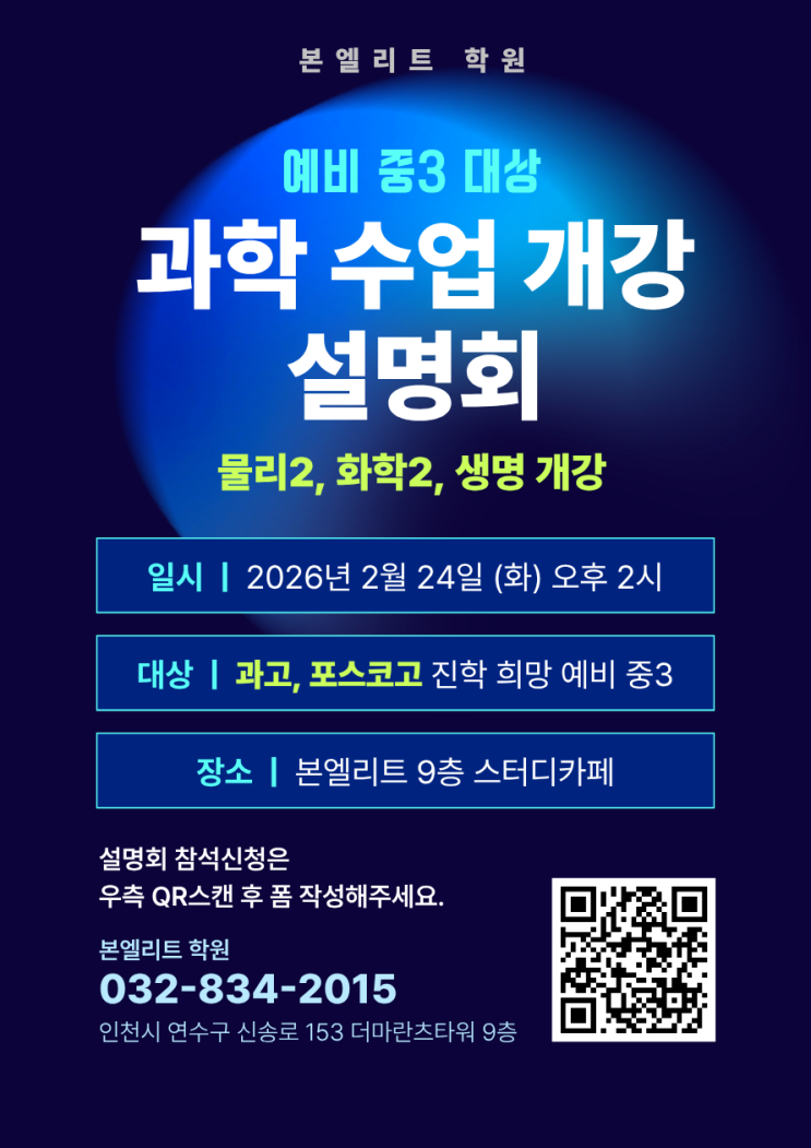 안녕하세요. 본엘리트 학원입니다. 과고·포스코고 진학을 준비하는 예비 중3 학생을 대상으로 2026년 2월 24일(화) 오후 2시, 과학 수업 개강 설명회를 진행합니다. 이번 설명회에서는 물리Ⅱ, 화학Ⅱ, 생명 수업 개강에 대해 안내해 드릴 예정입니다. 고입을 앞둔 중요한 시기, 전략적인 과학 학습의 방향을 잡을 수 있는 시간이 될 것입니다. 과학고·포스코고 진학을 목표로 하는 학생이라면 이번 설명회를 통해 체계적인 준비를 시작해 보세요. 감사합니다. 예약은 위 QR 스캔이나 혹은 아래 링크를 통해 폼 작성해서 제출해주세요. 설명회 신청 : https://naver.me/F5sQ9KWh <img src="https://blogthumb.pstatic.net/MjAyNjAyMTNfMjQw/MDAxNzcwOTc1Nzg1Mjc0.PMk_zbrtFmkO9f8SNzQ5okG-SgmVy0ehBC7LVkfUhwcg.NBseW8DJPEytdEamVEt6YUugnSANw1GqDD8AS4i5sskg.PNG/%B0%FA%C7%D0%BC%F6%BE%F7%B0%B3%B0%AD%BC%B3%B8%ED%C8%B8v3.png?type=s3" />