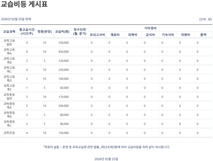 학원 교습비 및 등록증