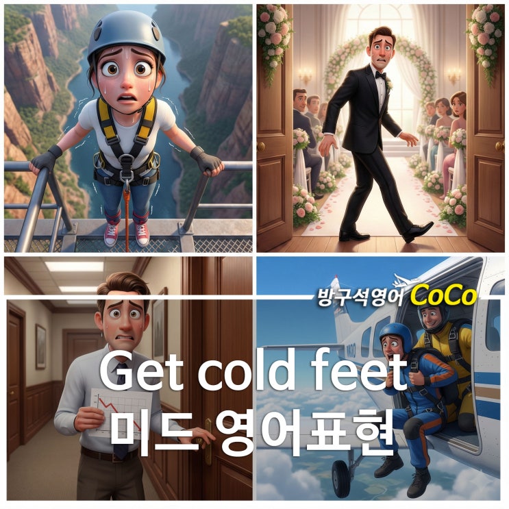 안녕하세요 여러분! 매일매일 여러분의 영어 세포를 심폐소생술 해드리는 방구석영어 코코입니다. 다들 그러신적 있으시죠? 호기롭게 '나 오늘 번지점프 뛴다!' 하고 올라갔는데, 막상 아래를 내려다보니 갑자기 다리가 호달달 떨리면서 '아... 나 그냥 내려갈래...' 했던 경험! 혹은 짝사랑하는 사람에게 고백하려다 카톡 썼다 지웠다 하다가 결국 전송 버튼 못 누르고 이불킥 한 경험! 오늘 우리가 배워볼 영어 표현이 바로 이 웃프고도 찌질한(?) 순간을 완벽하게 표현하는 단어랍니다. 메모장 켤 준비 되셨나요? 그럼 바로 시작할게요! 슝슝~ Get cold feet 대체 무슨 뜻일까요? 잠깐! 약국 가서 혈액순환 개선제 찾으시....... <img src="https://blogthumb.pstatic.net/MjAyNjAyMjVfMjY3/MDAxNzcxOTg1MDA0MDE4.-_LjlKVZH842GPDqi9bxDzD_z6tyxbZctPHmv-qZdKMg.eJFy42-dOHYHKhGewHJM5pCROuq7J0ziEb3aHGqHSccg.JPEG/getcoldfeet%B6%E6%B9%CC%B5%E5%BF%B5%BE%EE%C7%A5%C7%F6%C7%A5%C1%F6.jpg?type=s3" />