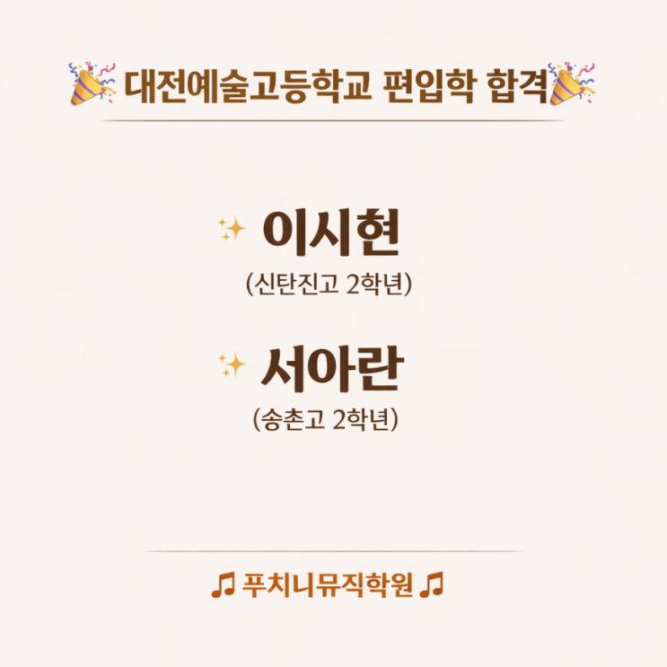 편.입학을 축하합니다~♡ 송촌동피아노전문학원 일반고 학생들의 대전예술고등학교 편입학을 진심으로 축하합니다~~ 송촌동음악전문학원 앞으로의 빛나는 미래를 꿈꾸며 더욱 발전해나가는 우리 학생들이 되길 바래봅니다~ 송촌동피아노,송촌동음악 #신탄진고 #송촌고 #대전예술고등학교 #편입 #전입 #예중 #예고 #입시전문 #제대로가르치는 #푸치니뮤직학원 ☎️ 042 / 322 / 5500 <img src="https://blogthumb.pstatic.net/MjAyNjAzMThfMTk4/MDAxNzczNzkwNjc2Njgw.G5SkVwUTesdhQWubHNXF2eVh2wl5ONeDLQxVt5yIdVkg.PEXknybUqvO7JJMCb80Cy08CS5j0e3e1JGjdfco1Ykog.PNG/900%A3%DFfile%A3%DF00000000f8d07206888a0c2687ebe7bd.png?type=s3" />
