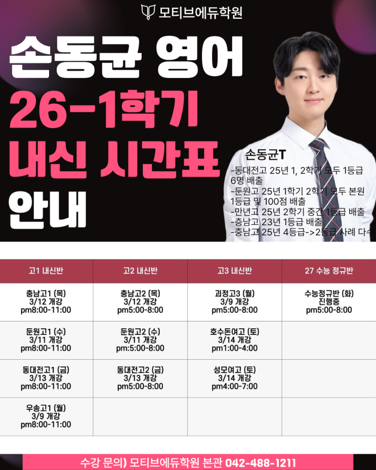 [제 서 5296호] 둔산동 국어 / 영어 / 수학 / 과학 / 사회 상위권이 선택한 내신&수능 전문 모티브에듀학원 안녕하세요 모티브에듀학원입니다! 오늘은 고등부 영어과 손동균 선생님의 고3 수능영어반을 포함하여 고1, 2, 3학년 친구들의 26-1학기 내신 시간표를 소개해 드리려고 합니다. 이번 1월, 2월 윈터스쿨 기간 내내 동균 선생님 반으로 정말 많은 수강생들의 유입이 있었고, 또 우리 친구들이 그 이상으로 작년 25년 한 해 동안 굉장히 우수한 성과를 내주었는데요! 그래서 이번 26-1학기 내신반 또한 기대가 되는 순간입니다. 무수히 많은 성과들로 인해서 이번 3월 저희 동균 선생님의 신규생은 70명에 다다랐습니다. 이렇게 많은 신....... <img src="https://blogthumb.pstatic.net/MjAyNjAzMThfMzQg/MDAxNzczODE1NTIyOTQw.cYVhGJQ9GZqcckx8_edGcgUG7JPUNAVZk9Bk8VZuPm4g.3r-xPB7YMTHkaGn6O1cqxYoUwu8dHZgZge4q-UnDgWog.PNG/1.png?type=s3" />