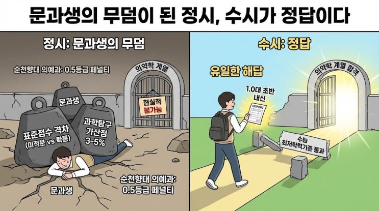 서울대 간판인가, 의치한 면허증인가 최상위권 문과 학생들과 상담을 하다 보면 어김없이 등장하는 밸런스 게임이 있습니다. 바로 '서울대 경영학과'와 '지방대 한의예과' 중 어디를 선택할 것인가 하는 질문입니다. 과거에는 문과 1등이면 주저 없이 서울대를 외쳤지만, 평생직장의 개념이 희미해진 요즘은 전문직 면허증이 주는 안정감에 끌려 이른바 '문디컬(문과+메디컬)'을 진지하게 고민하는 학생들이 압도적으로 많아졌습니다. 하지만 의대 정원 확대와 문·이과 통합 수능이라는 거대한 파도 속에서, 순수하게 문과 과목(확률과 통계, 사회탐구)을 공부하는 학생들이 의약학 계열의 문을 두드리는 것은 결....... <img src="https://blogthumb.pstatic.net/MjAyNjAyMjVfMjkw/MDAxNzcxOTkzODAzMTky.hW4u1qkJf2J705lM3eQcHjkw56zIbmDyuLHadZX8in8g.5uZYViInNmGVOKFj5XHcd5f4ZX134mJaitwz60uMVMsg.JPEG/1.jpg?type=s3" />