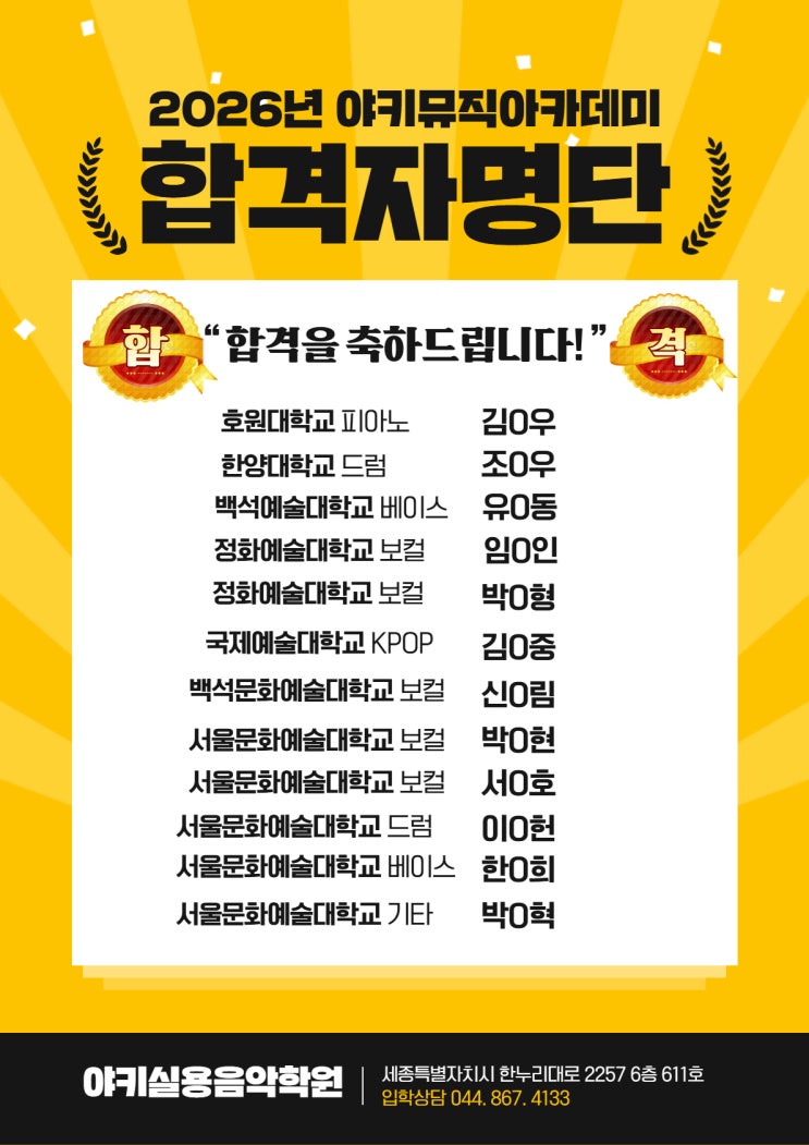 2026 예고 및 예대 다합격자 배출!![야키뮤직아카데미/세종시실용음악/세종예고합격생/세종예고합격자/세종예고합격자발표/세종예고합격/세종예고/세종예고입시/예고/예대/합격자
