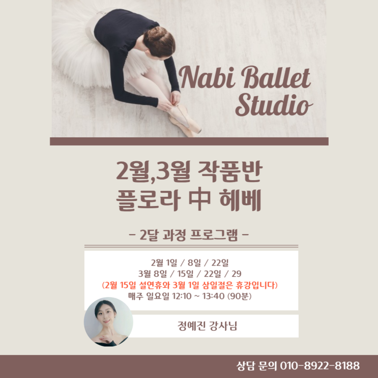 안녕하세요 ^^ 나비발레 성인강좌 매주 일요일 작품반 수업 일정이 변경되어 재공지 합니다. 기존한달 과정이 2달 과정으로 변경되었으니 참고 바랍니다. 바 수업과 작품 수업을 함께 진행합니다. 작품명: 플로라 中 헤베 -2달 과정 프로그램- 매주 일요일 12:10 ~13:40(90분) [2월15일 설연휴와 3월1일 삼일절은 휴강입니다] 정예진 강사님 봄을 느낄 수 있는 작품반 수업, 많은 관심 바랍니다 ~!! https://www.instagram.com/nabi_ballet/ https://naver.me/F3TjfssT http://pf.kakao.com/_GxcWQxj #영통취미발레 <img src="https://blogthumb.pstatic.net/MjAyNjAyMDRfMTI0/MDAxNzcwMTg0MDQ4MzA2.ruJ70FMtjBHJgDfc4T88Rh5YaHk2gNYyFBWwaRSjs00g.oDynL7PYuWHXfvtVGfWkupKUPplXo8C1QyT-4MCyRNMg.PNG/%C1%A6%B8%F1%C0%BB_%C0%D4%B7%C2%C7%D8%C1%D6%BC%BC%BF%E4_-003_%283%29.png?type=s3" />